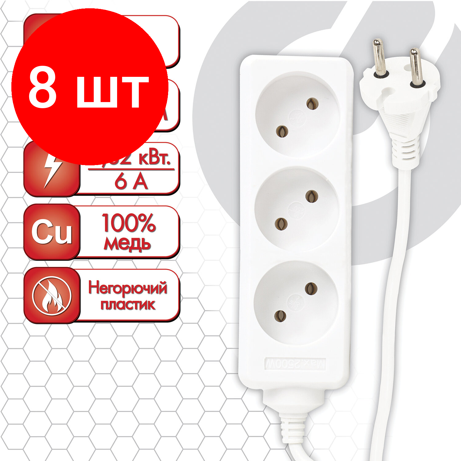 Купить Комплект 8 шт, Удлинитель сетевой SONNEN U-131, 3 розетки, без заземления, 6 А, 1.8 м, белый, 511428