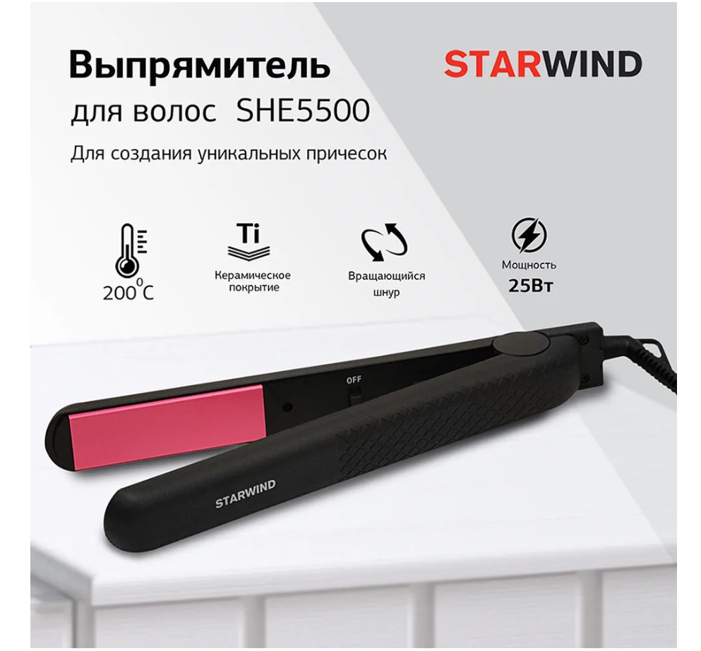 Выпрямитель Starwind SHE5500 25Вт черный/розовый (макс.темп.:200С) SHE5500