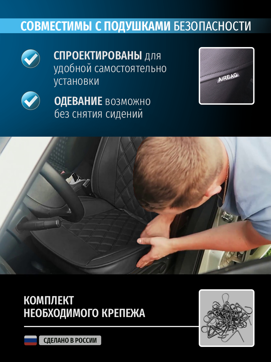 | Комплектация | передние спинки - 2, передние сиденья - 2, задняя спинка большая - 1, задняя спинка малая - 1, заднее сиденье сплошное - 1, подголовники передние - 2, подголовники задние – 3, задний подлокотник - 1, нижняя часть центра - 1, задняя отдельная шторка - 1, передний подлокотник 1 |