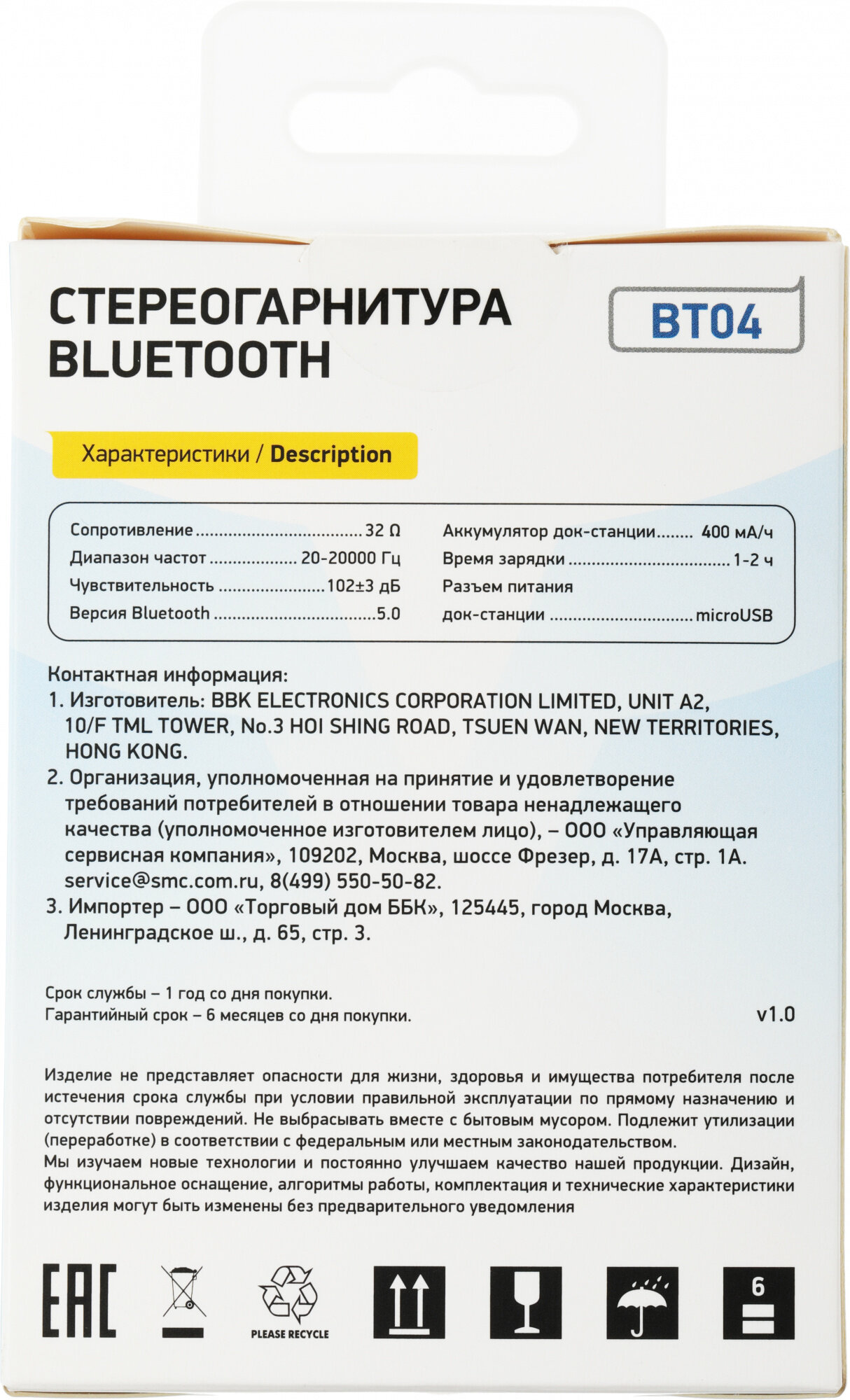 Bluetooth гарнитура BBK BT04 белый