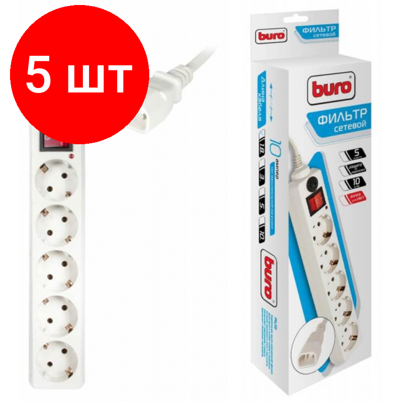 Купить Комплект 5 штук, Сетевой фильтр Buro 500SH-1.8-UPS-W 1.8м (5 розеток) белый