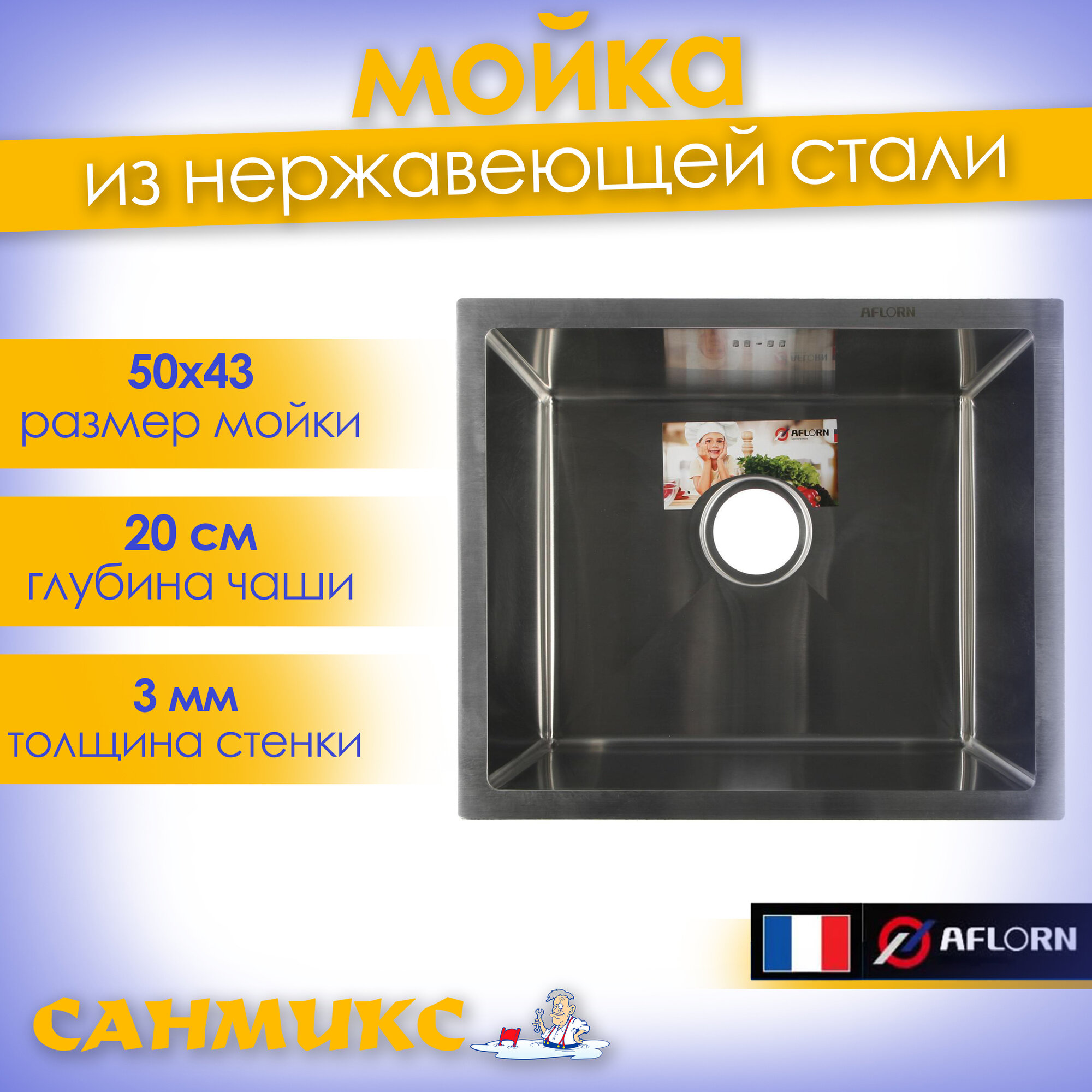 Купить Мойка кухонная AFLORN AF95043, врезная, S=3,0 и 0,8 мм, 50х43х20 см, сифон, сатин