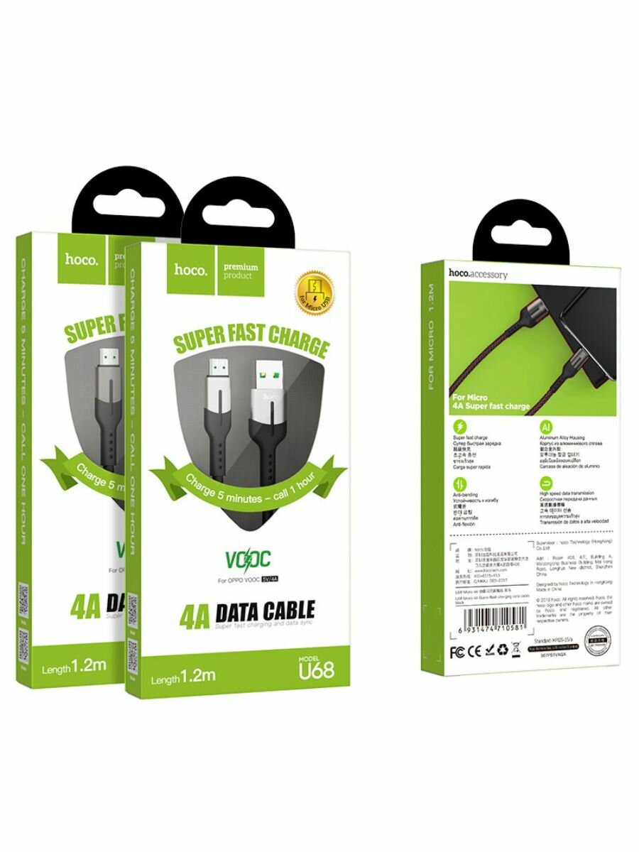 Дата-кабель Hoco U68 Gusto USB-MicroUSB (4 A), 1.2 м, черный