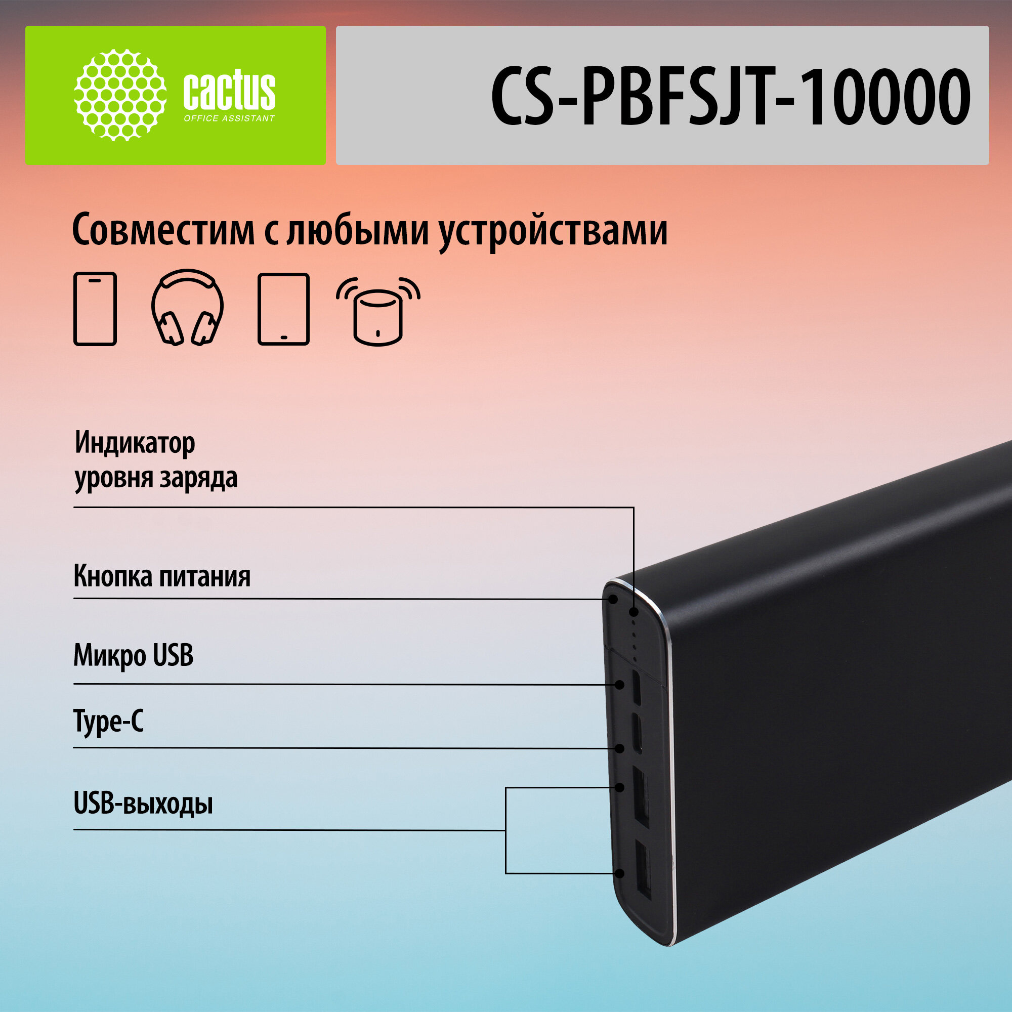 Аккумулятор внешний Cactus CS-PBFSJT-10000 10000 мАч, 2 А, micro USB/USB 2.0/USB Type-C (CS-PBFSJT-10000)