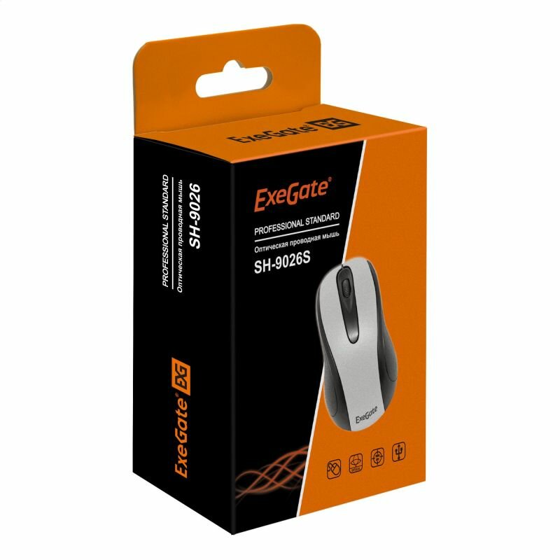 Мышь ExeGate Professional Standard SH-9026S (USB, оптическая, 1000dpi, 3 кнопки и колесо прокрутки, длина кабеля 1,35м, серебристая, Color Box) EX264098RUS