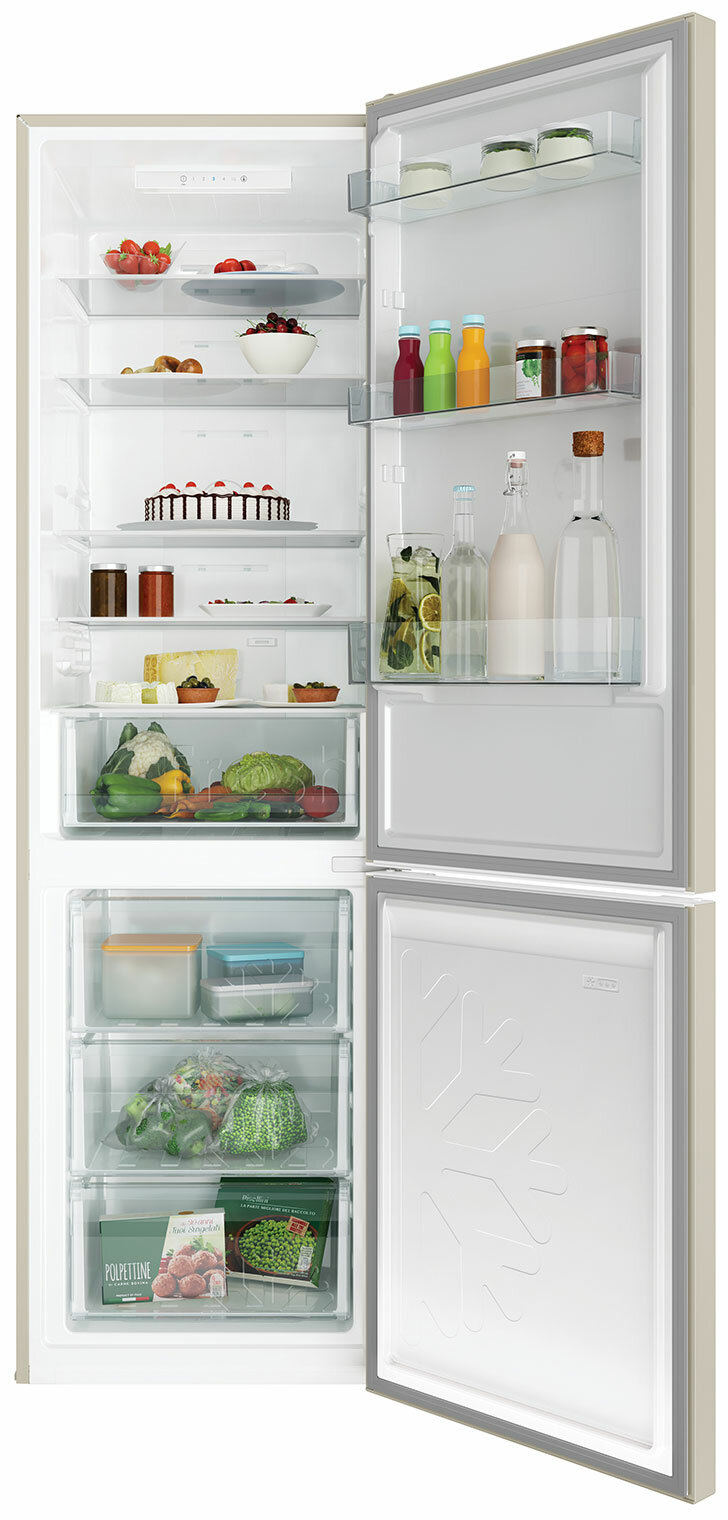 Холодильник Candy No Frost Plus+ CCRN 6200G двухкамерный, полезный объем 370 л, электронное управление, перенавешиваемые двери, автономное сохранение холода до 10 ч, режим суперохлаждения, LED-освещение, звуковое оповещение об открытой двери, золотой