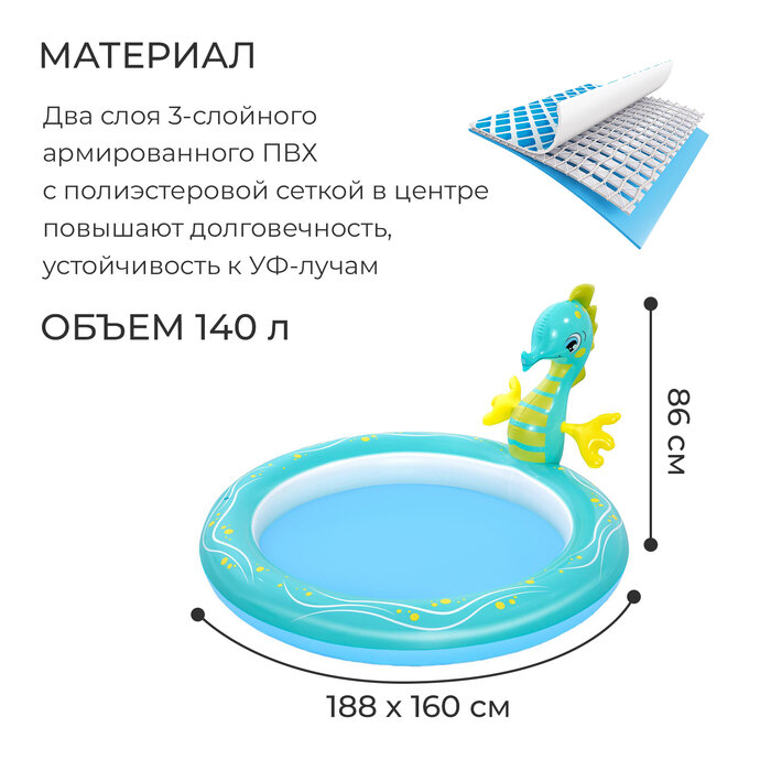 bestway 53114 бассейн надувной с разбрызгивателем seahorse 188*160*86см (8944) бассейн