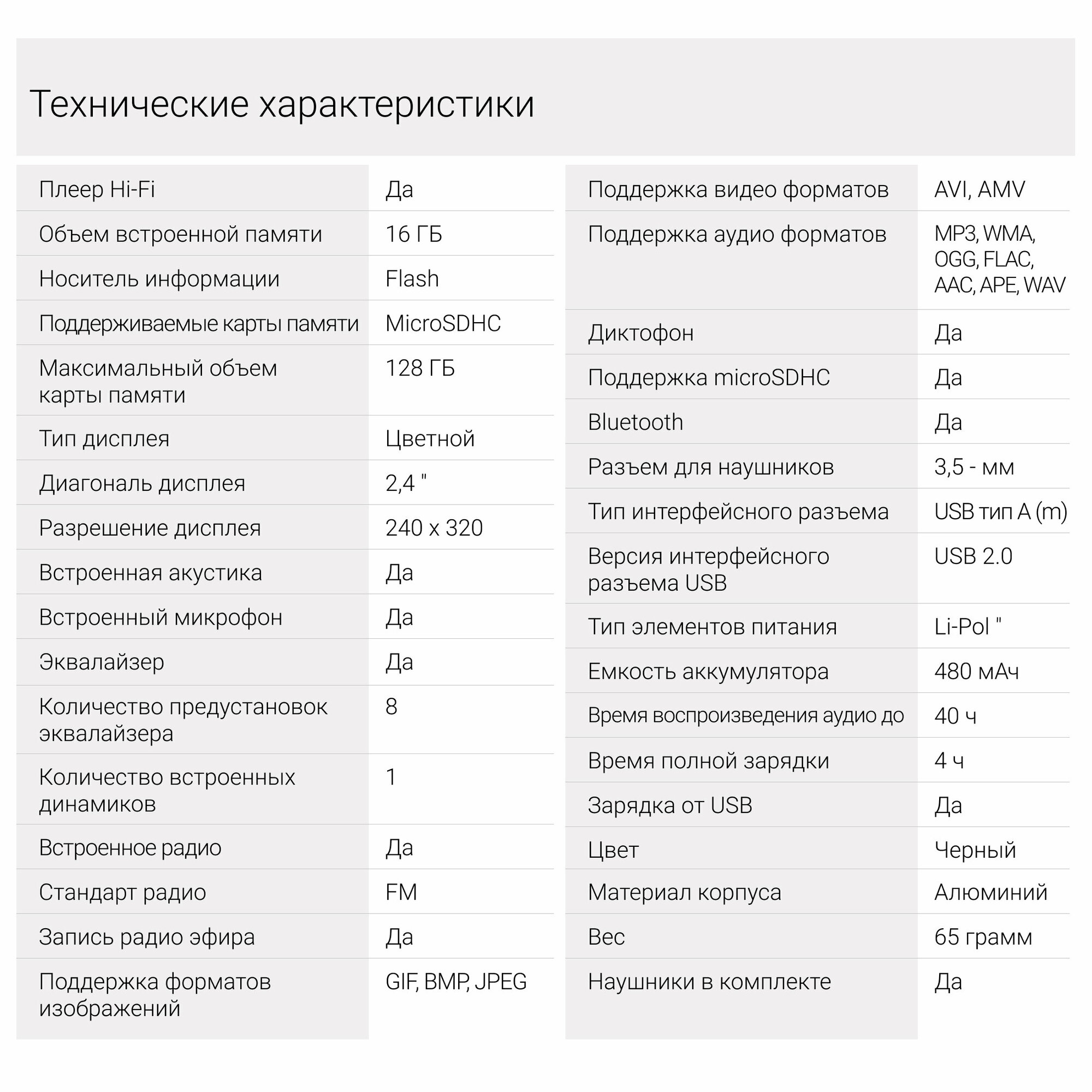 2. Солидный вид. По дизайну красивый и стильный, ничего лишнего. Задняя часть корпуса из металла. Тяжёленький, но приятно лежит в руке. 3. Слот MicroSD. Тянет полностью забитую музыкой флэшку на 64ГБ без тормозов и глюков. + Его память на 16ГБ. В итоге имеем хороший плеер почти на 80ГБ. Это, пожалуй, самый главный плюс. 4. Аккумулятор - бомба! Тот случай, когда плеер "строили" вокруг аккумулятора). Тянет на полную заявленную катушку. Если по проводным наушникам - слово "зарядить" забудете на 3-4 дня. Производитель здесь точно не обманул. По блютузу - 5 часов. Пыжится, греется, но вытягивает и это время. 5. Bluetooth - это хорошо, но уже как чудо, не воспринимается. Синхронка работает чётко, проблем не было что с BT-колонкой, что с BT-ушками. Главный плюс всего этого - в дальней поездке, экономит заряд смартфона. 6. Удобство управления, не вынимая из кармана. Кнопки в меру тугие, сам не переключится точно. К интуитивному нажатию на нужную кнопку - привыкнуть пару часов. 7. Воспроизведение треков вне зависимости от зарядки и навигации по папкам. |