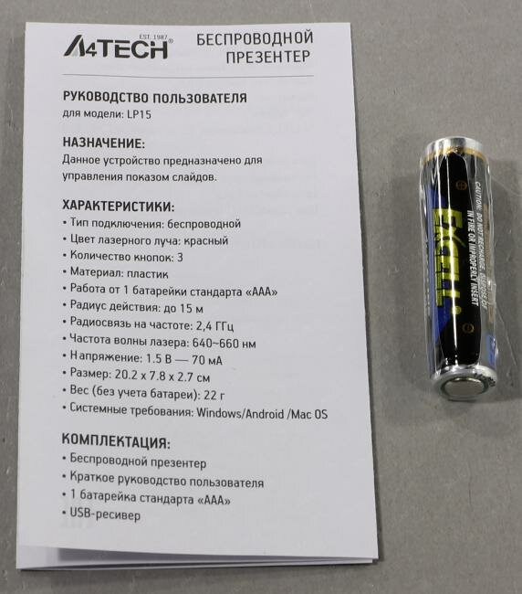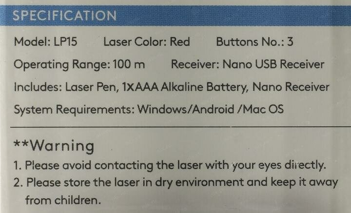 Использую этот презентёр на уроках. Очень полезна встроенная лазерная указка. Форма удобная, все равно что маркер в руке держать. Мне кажется эта указка бьёт дальше 15 метров, что указано в описании, так как на 20м точно бьет.. Даже на китайском на коробке написано что 30м. |