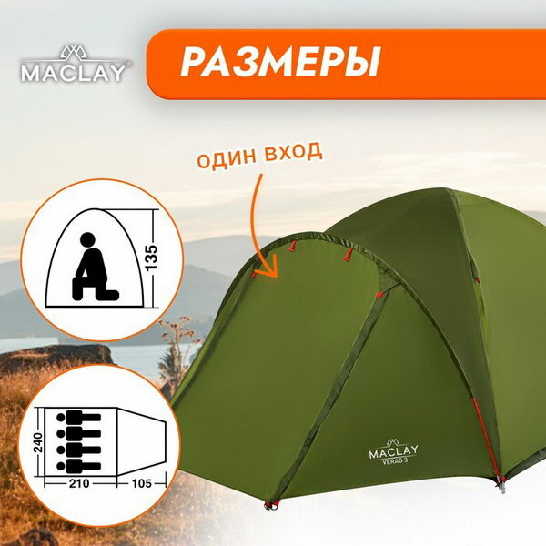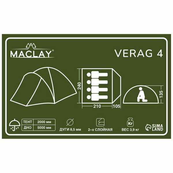 Палатка туристическая Verag 4, размер 330 х 240 х 135 см, 4-местная, двухслойная Maclay 5385304 .