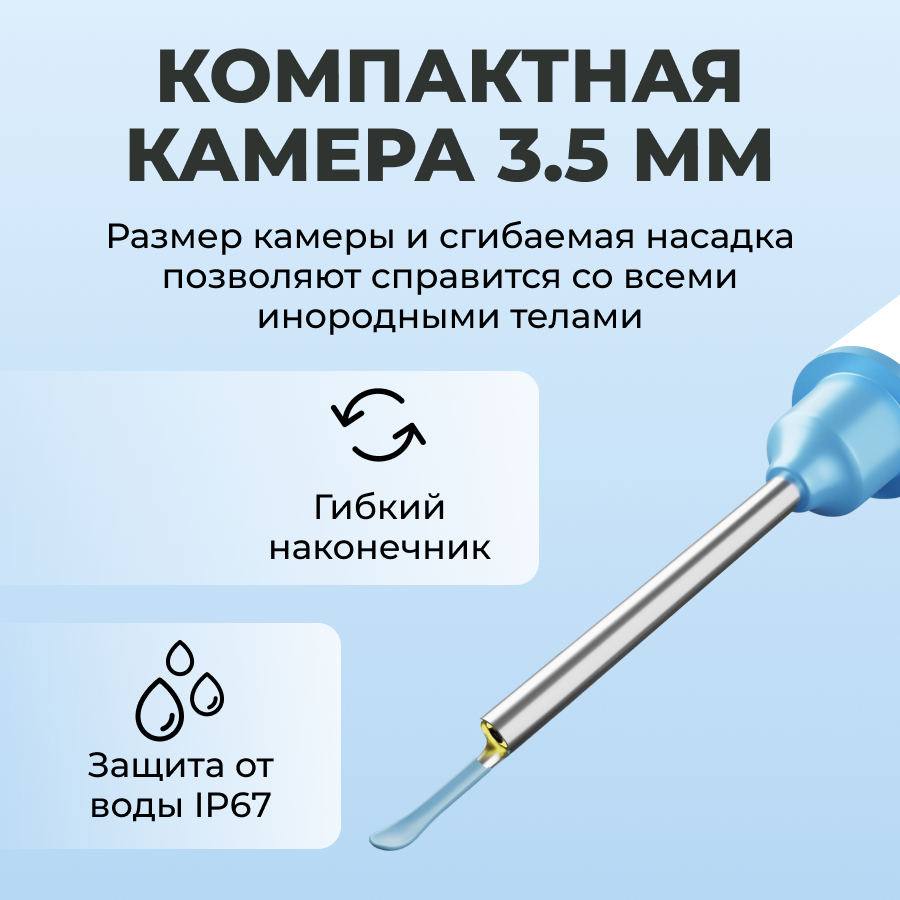 | Минусы: | Хотелось бы более короткий фокус. В области барабанной перепонки удалить отложения сложно и дискомфортно. Необходимо соблюдать осторожность, чтобы не повредить её. |