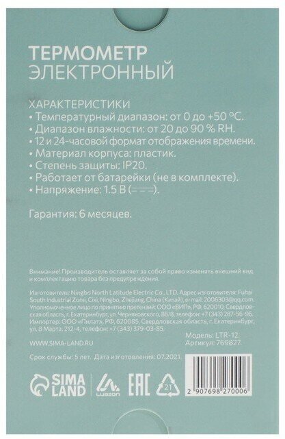 Ниже Вы можете прочитать отзывы на Термометр Luazon LTR-12, электронный, указатель влажности, часы, микс 769827, ознакомится с подробными характеристиками, посмотреть интересные обзоры и фотографии на Термометр Luazon LTR-12, электронный, указатель влажности, часы, микс 769827.