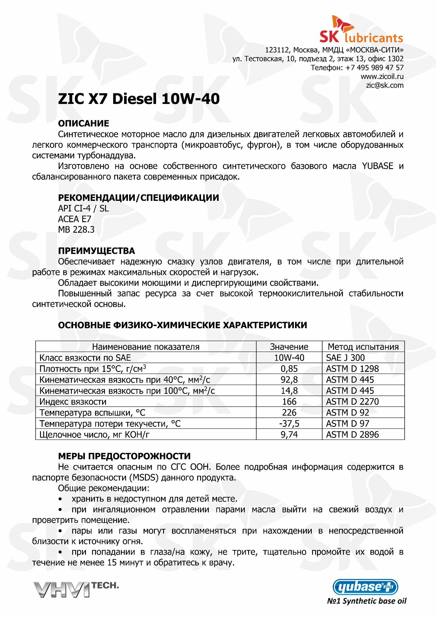 Масло моторное синт. ZIC X7 Diesel 10W-40, 6л. ZIC / арт. 172607 - (1 шт)