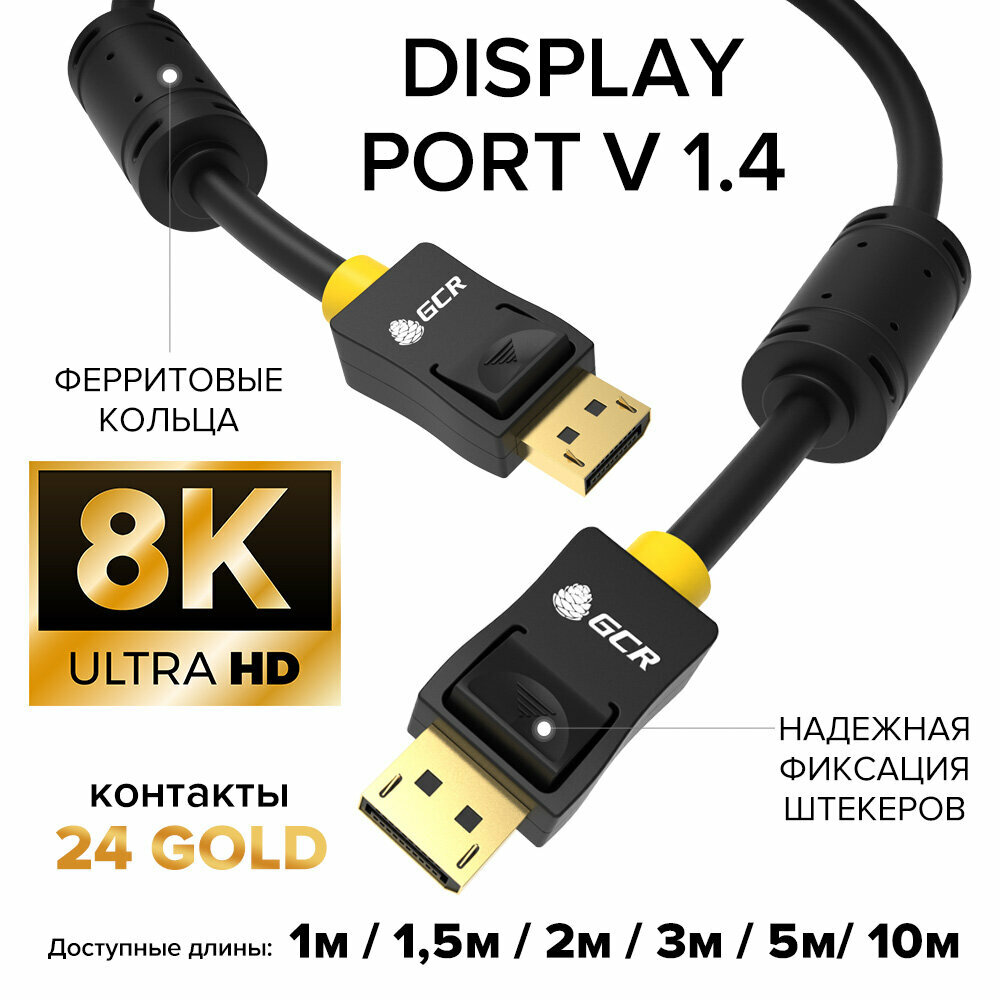 Кабель DisplayPort v1.4 8K 60Hz 4K 32 Гбит/с ферритовые кольца для ТВ PS3 PS4 X-Box 360 Blue-Ray 24K GOLD (GCR-DP4DP14), черный, 10.0м
