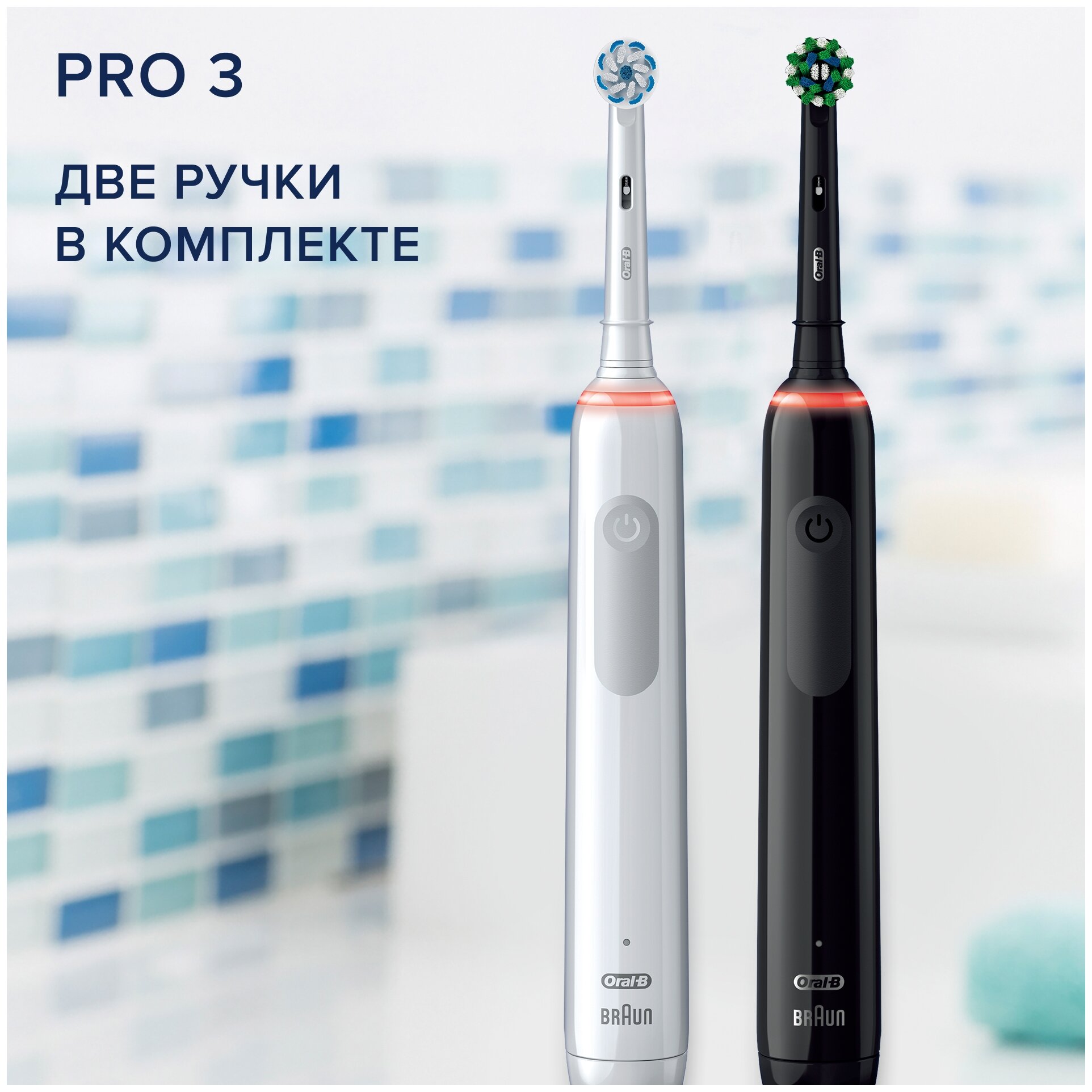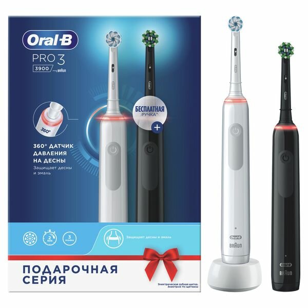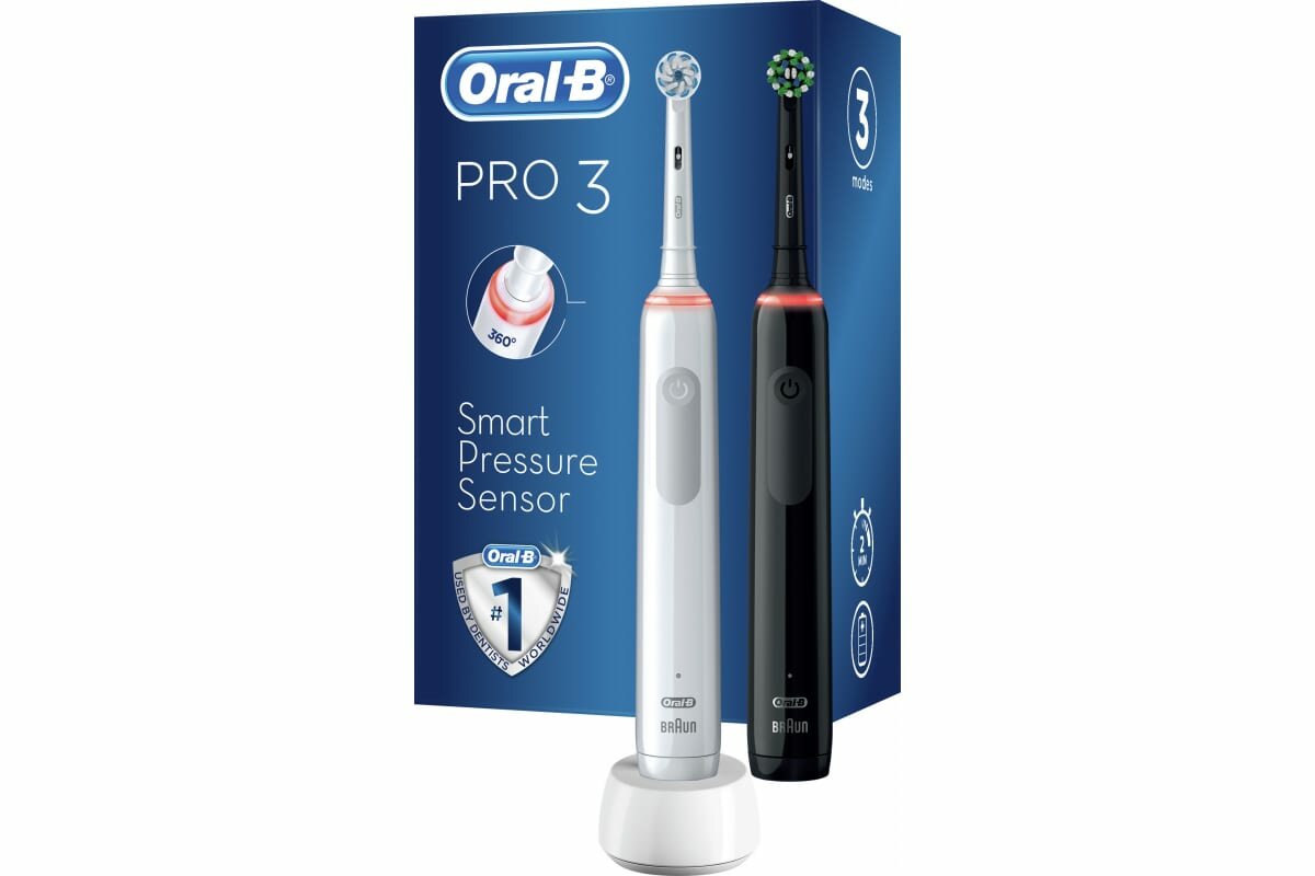 Набор электрических зубных щеток Oral-B "Pro 3", 3 режима, 2 насадки, черный/белый