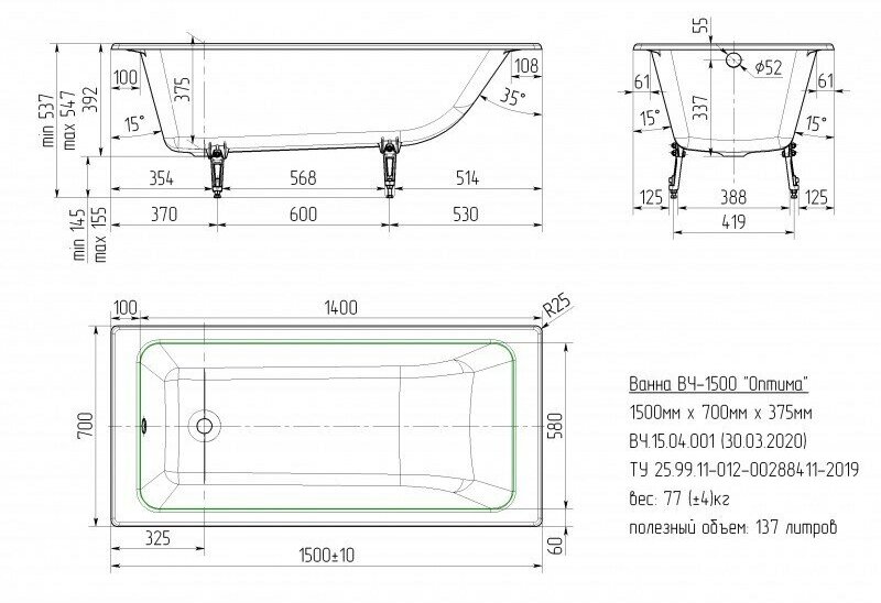 Ванна чугунная Wotte белый Line 1500x700 интересное: