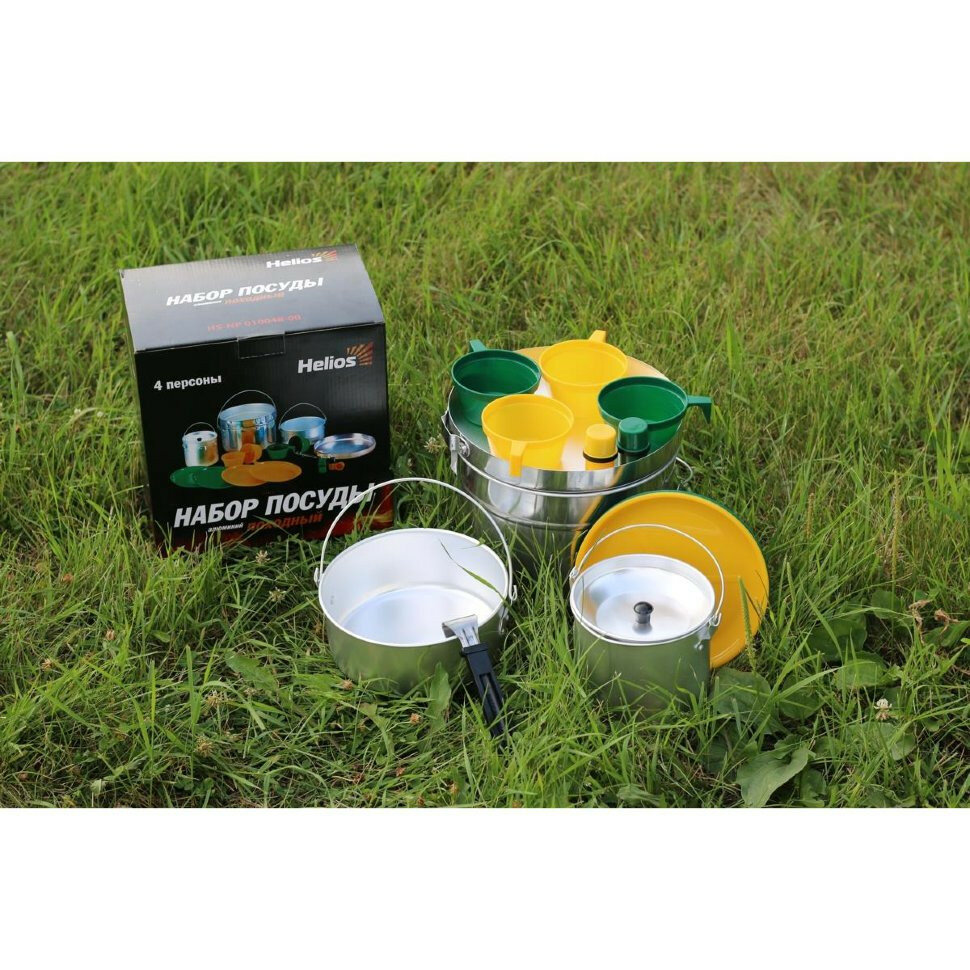 Набор туристической посуды HELIOS HS-NP 010048-00, 14 предметов, серебристый/зеленый/желтый