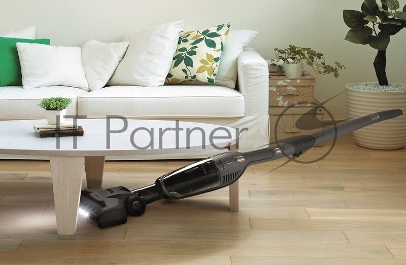 Щетка фиксируется, поэтому пылесос может самостоятельно стоять. Для своих функций весьма мощный. Батареи хватает на всю уборку. |