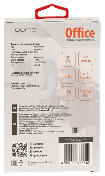 Мышь Qumo Office M14 Red, проводная, оптическая M14 Red .