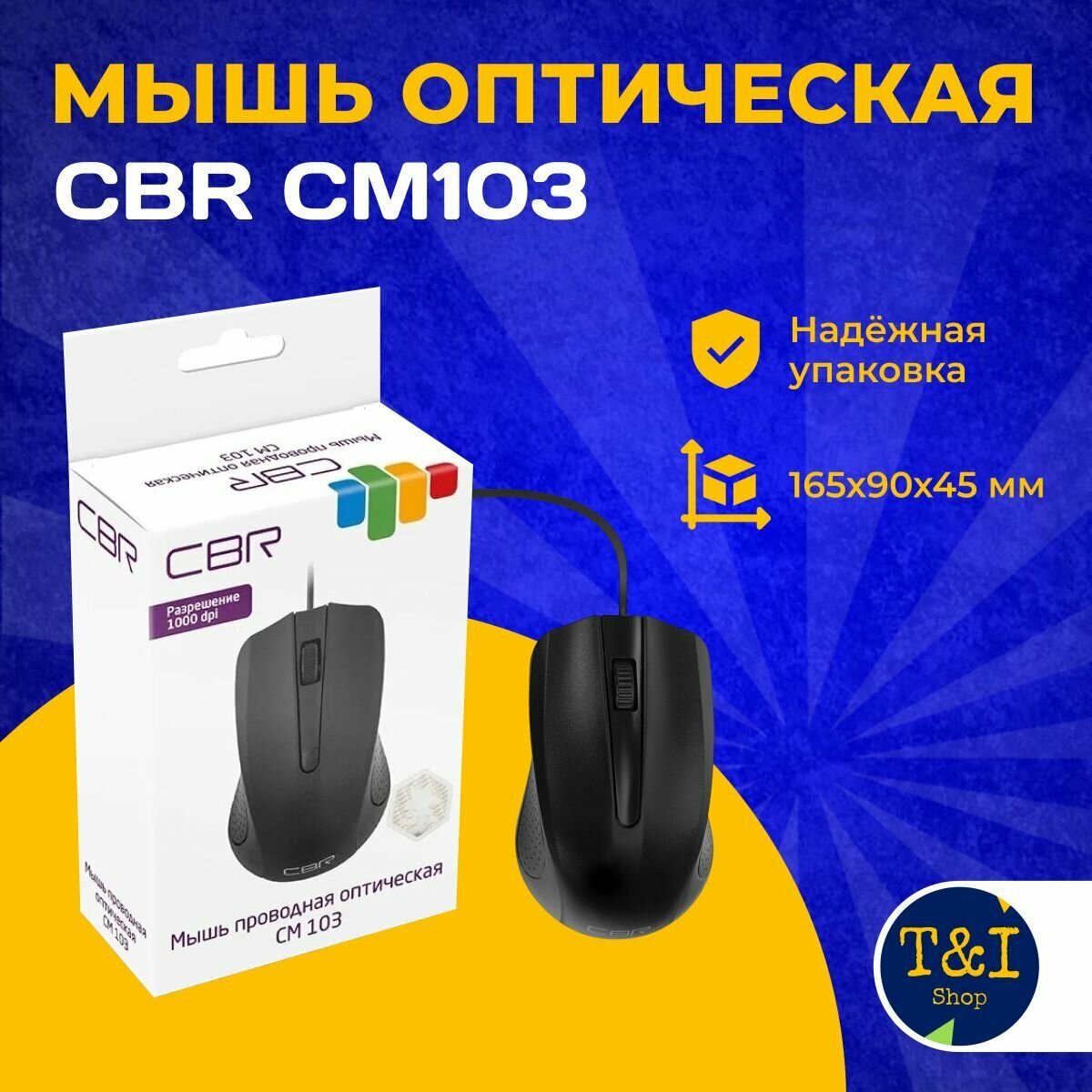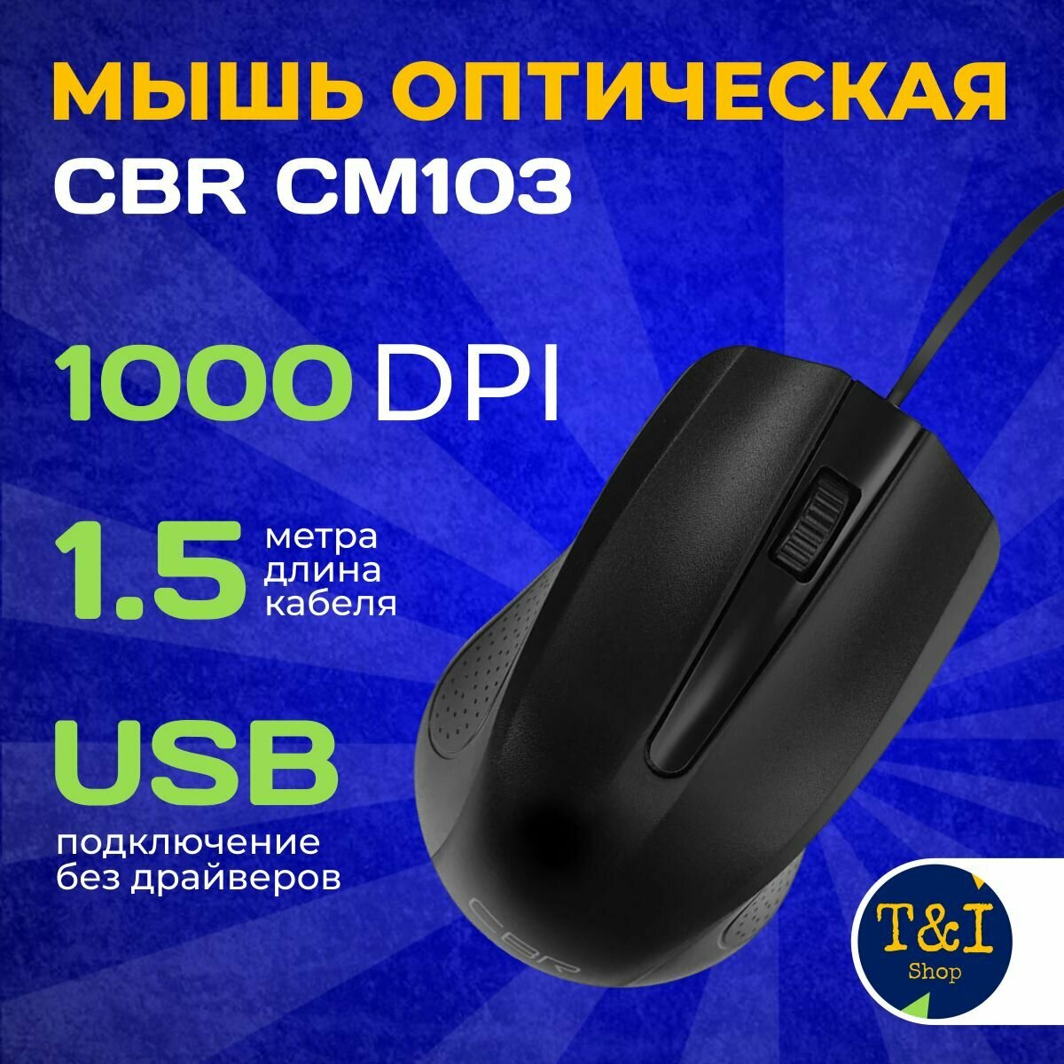 Cbr Мышь CM 103 Black, Мышь проводная, оптическая, USB, 1000 dpi, 3 кнопки и колесо прокрутки, длина кабеля 1,5 м, цвет чёрный