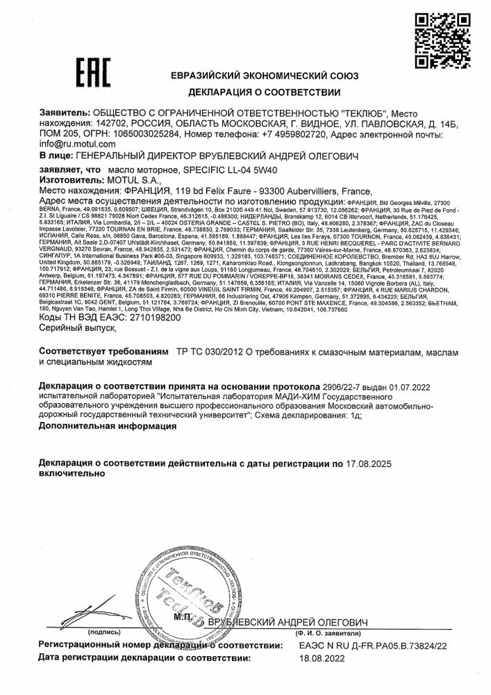 MOTUL Рњр°Сѓр»Рѕ Рјрѕс‚Рѕсђрѕрѕрµ Сѓрёрѕс‚Рµс‚Рёс‡Рµсѓрєрѕрµ Specific Ll-04 5W-40, 5Р»