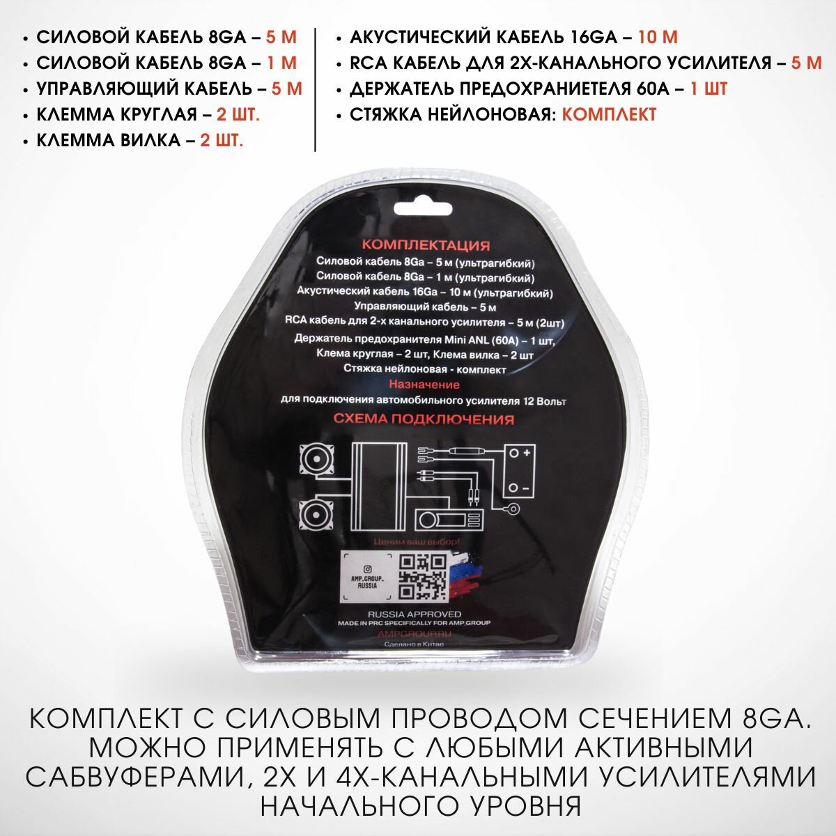 Провода комплект AMP 2.08 (CCA) для 2х канального усилителя
