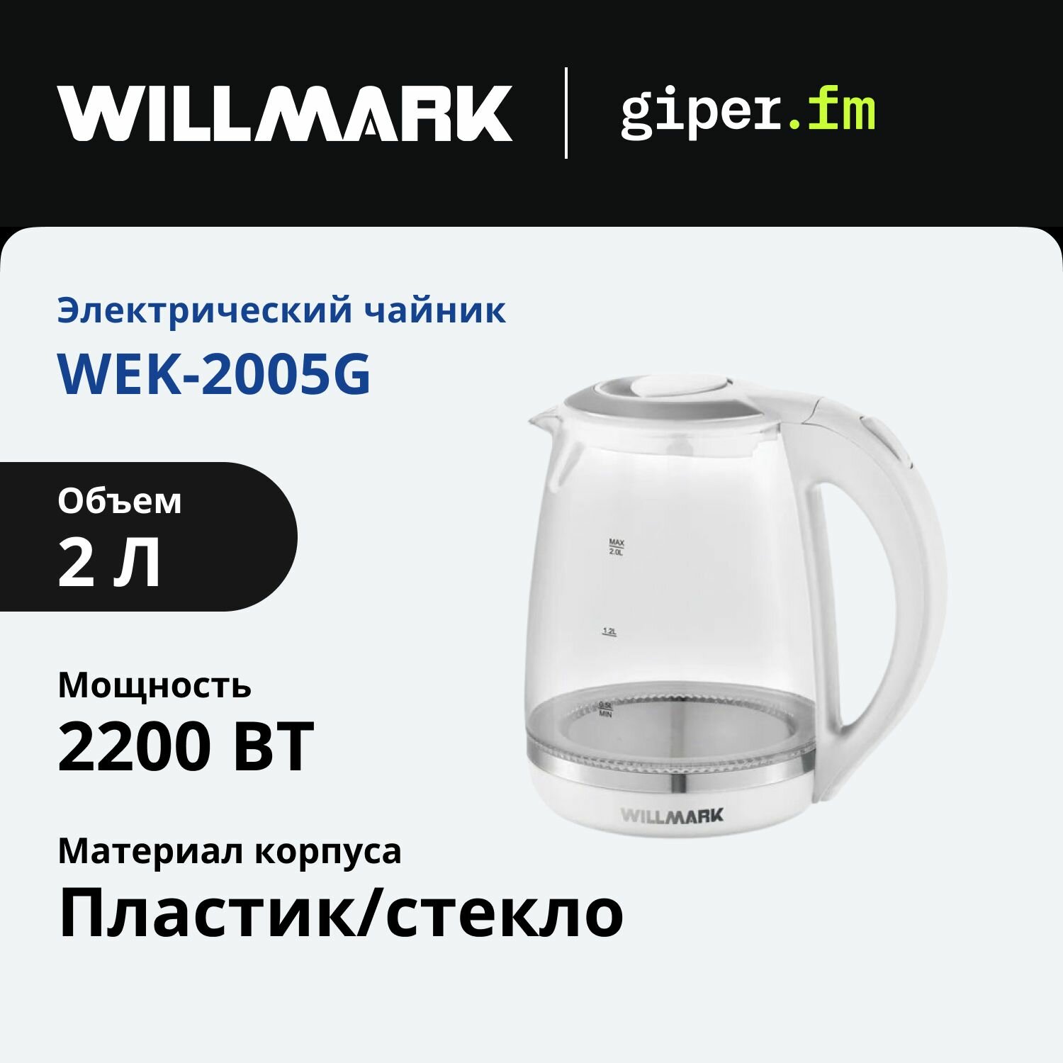Чайник эл. WILLMARK WEK-2005G (2.0л, пов. на 360 град., LED-подсв., корп. из стекла, 2200Вт)