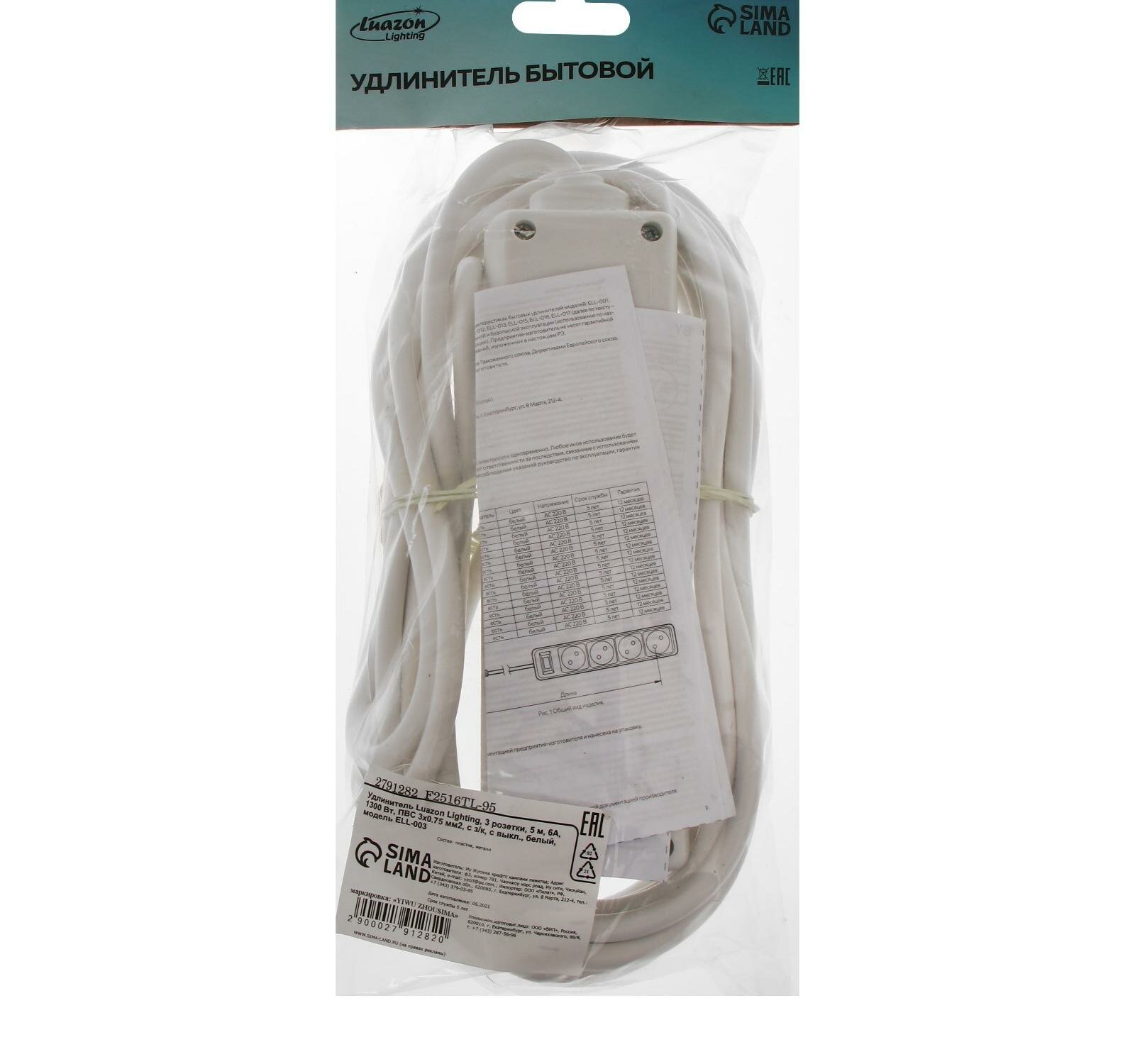 Удлинитель Luazon Lighting, 3 розетки, 5 м, 6 А, 1300 Вт, 3х0.75 мм2, с з/к, с выкл., Б интересное: