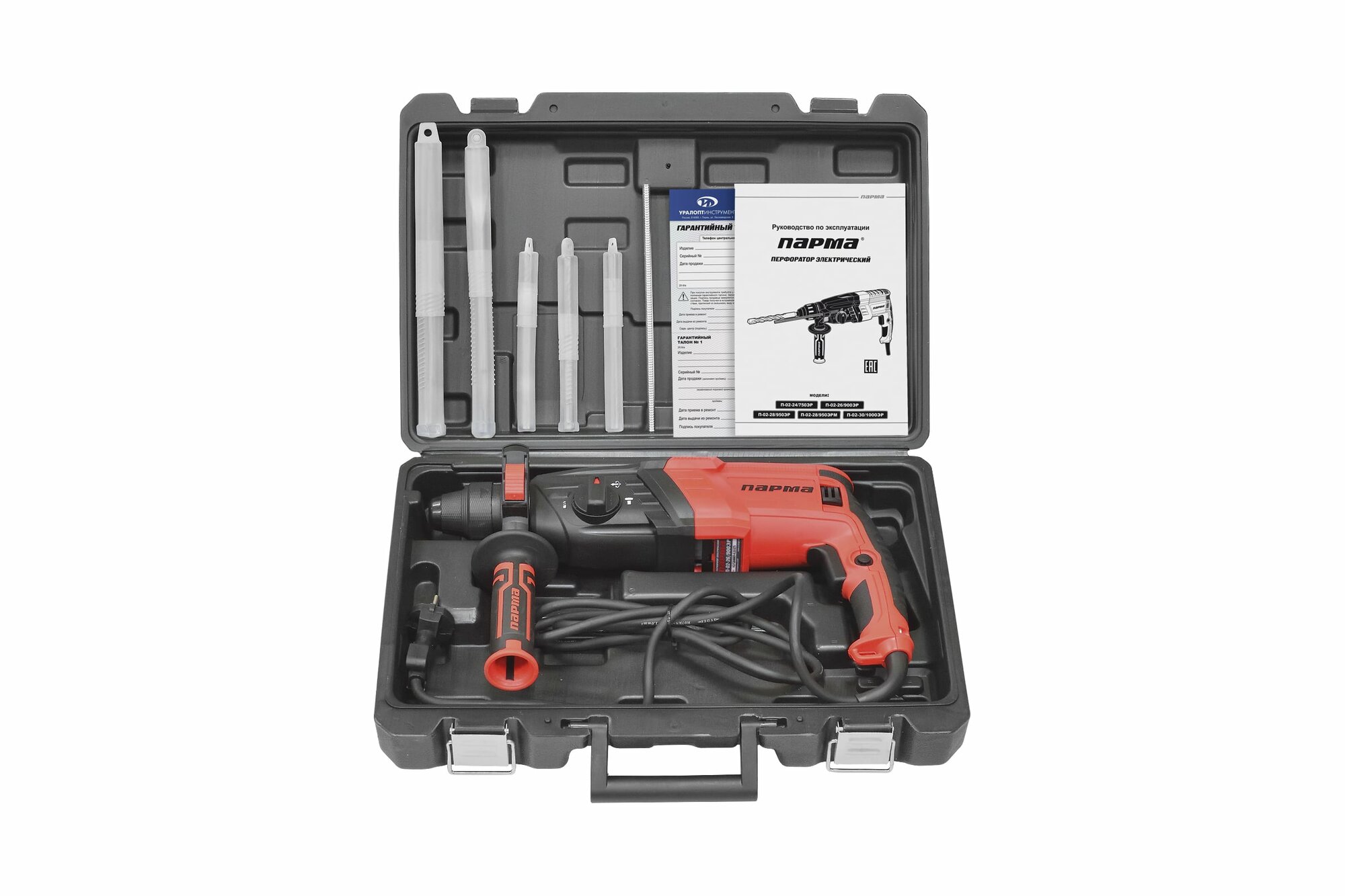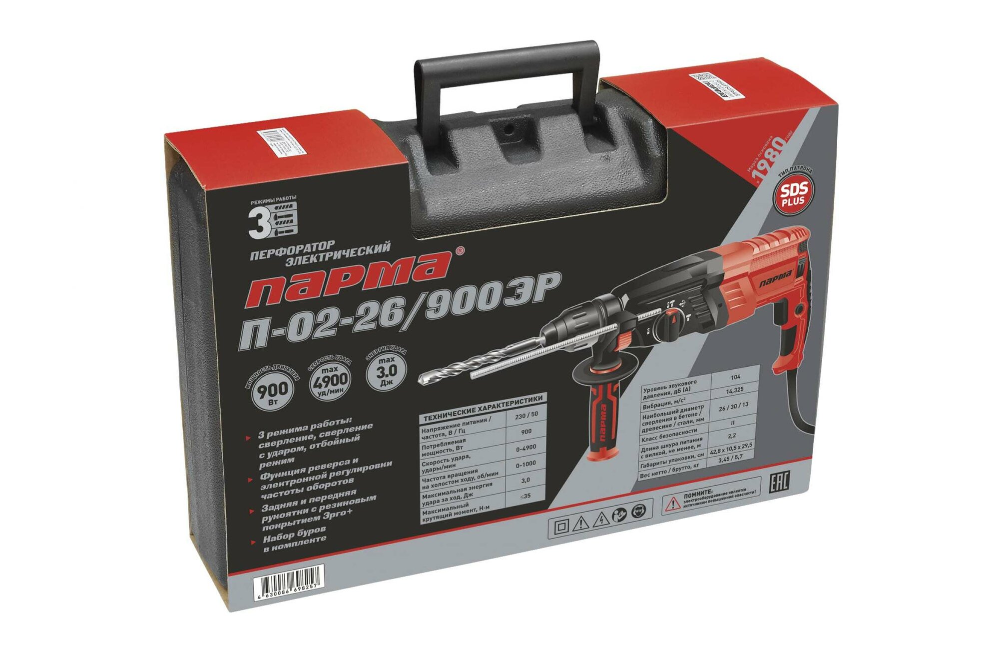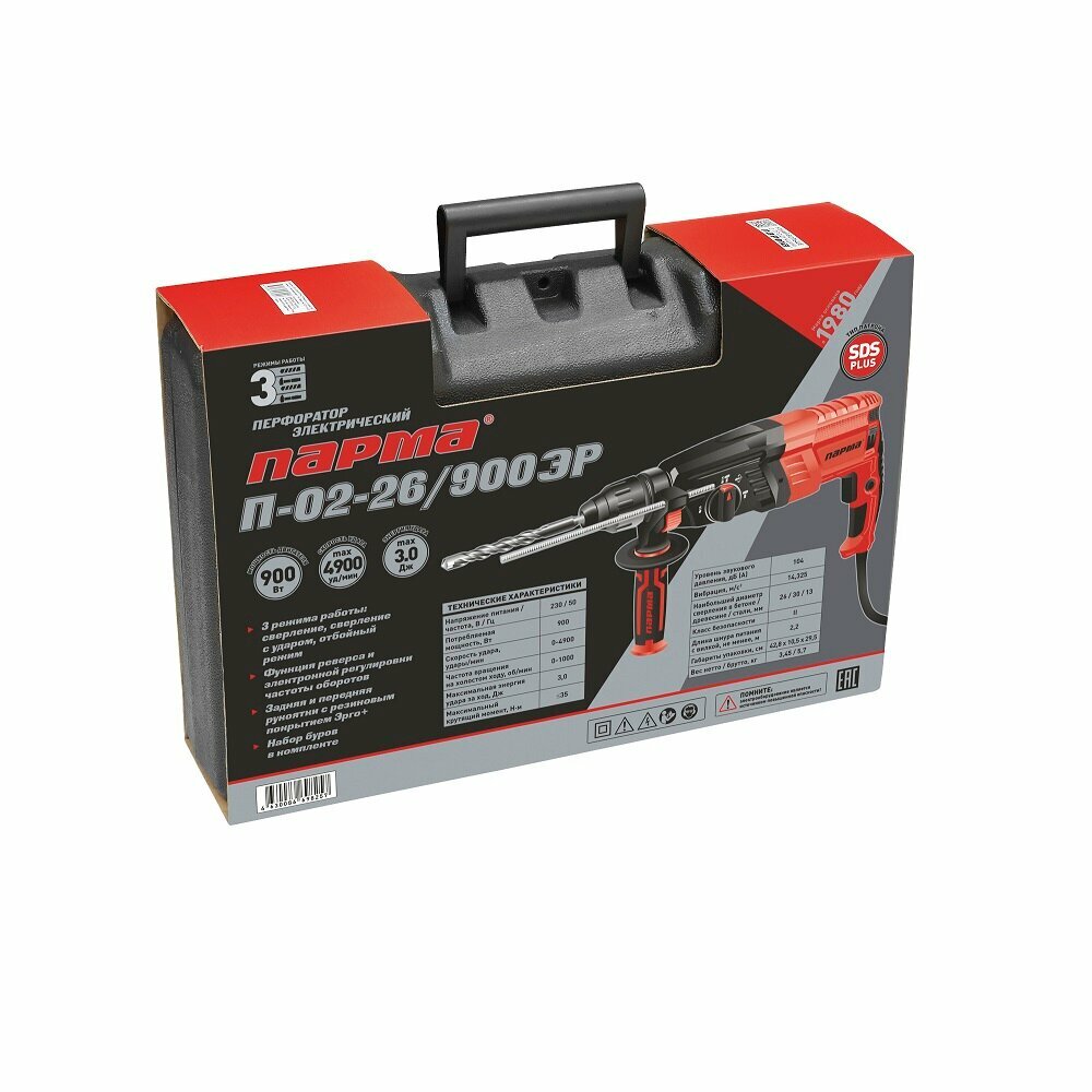 Перфоратор парма SDS-plus П-02-26/900ЭР (900Вт,3реж,3.0Дж,бетон 26мм) 3.45кг кейс+5 насадок