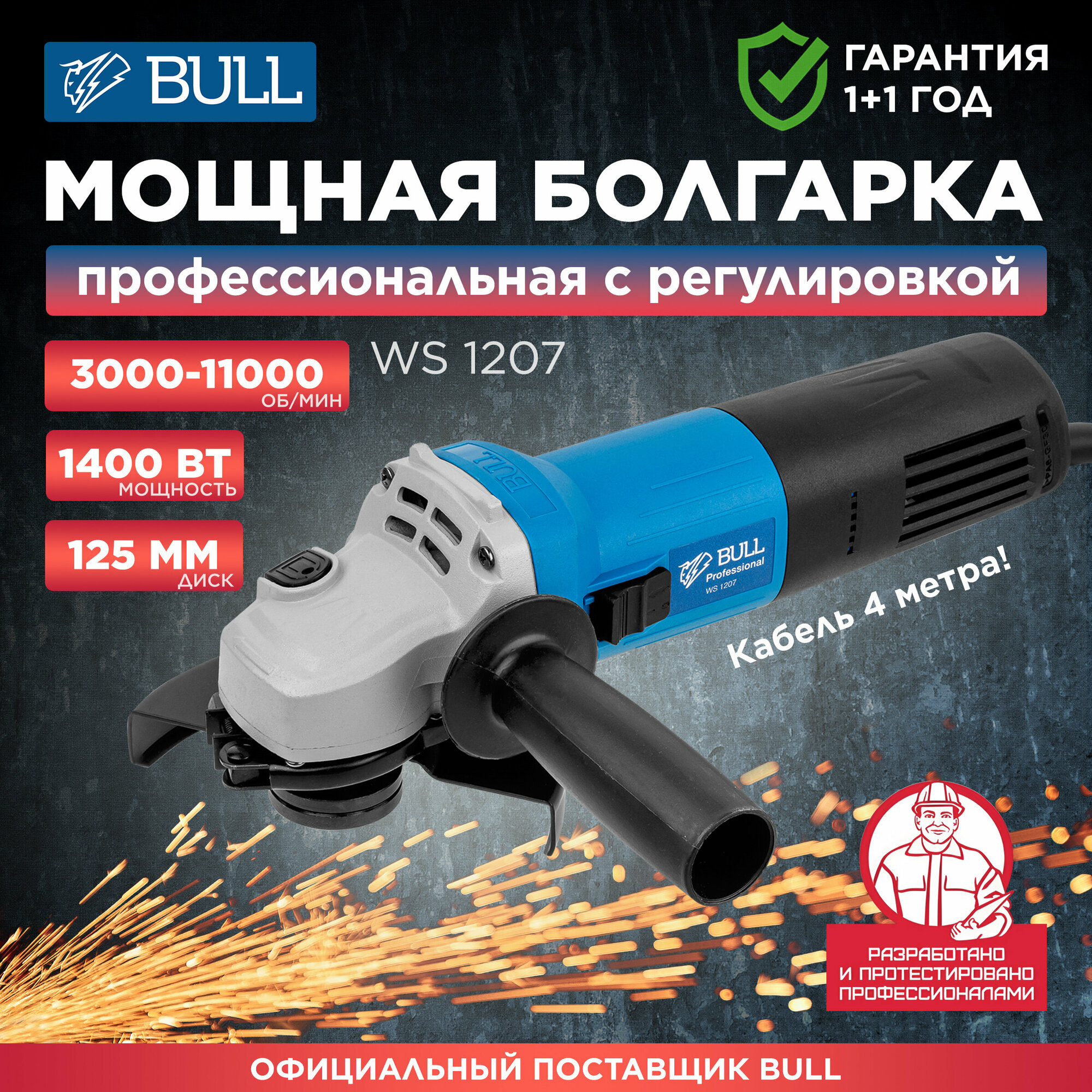 Одноручная углошлифмашина BULL WS 1207 в кор. (1400 Вт, диск 125х22 мм, регулировка оборотов, функция константой электроники) (329010)
