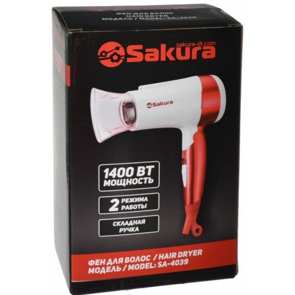 Фен для волос Sakura SA-4039WR, 1400Вт, 1 скорость, 2 температурных режима, бело-красный