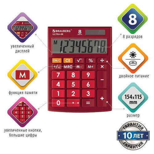 Калькулятор настольный BRAUBERG ULTRA-08-WR, компактный (154x115мм), 8 разрядов, бордовый, 250510