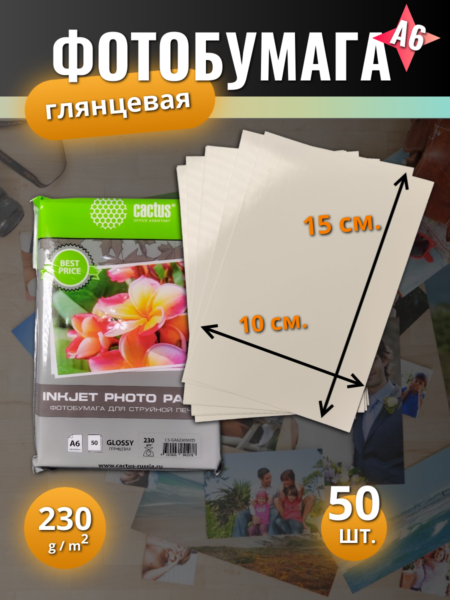 Фотобумага Cactus A6 10x15 глянцевая, 230г/м2, 50л, белая для струйной печати CS-GA623050ED