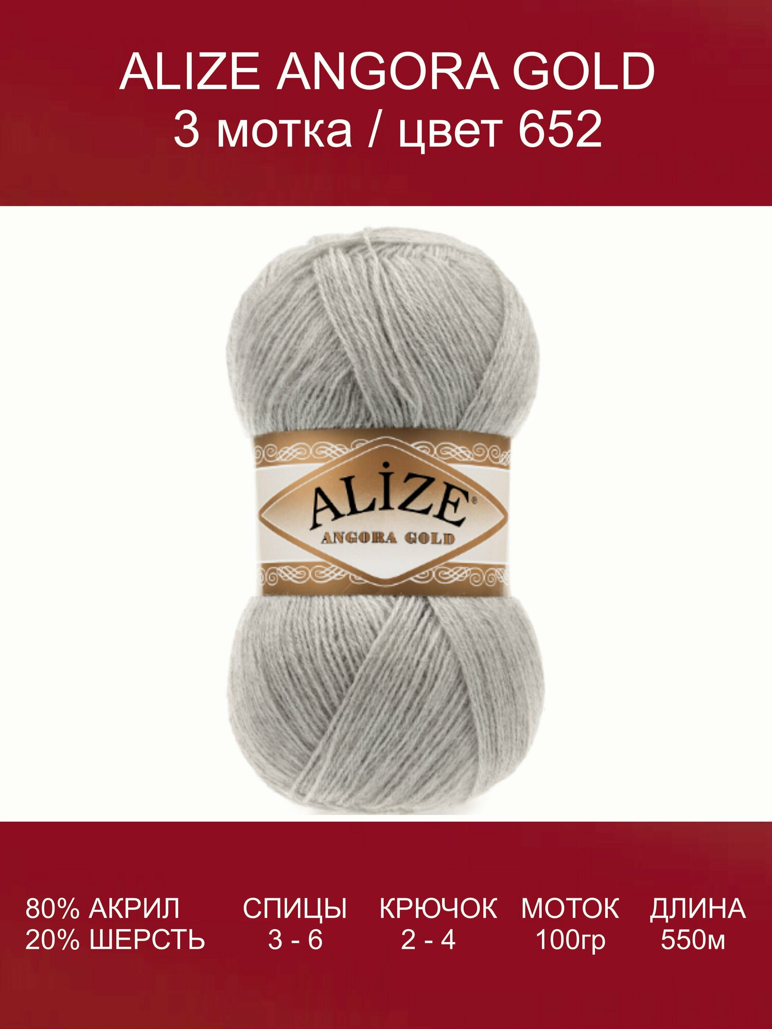 Купить Пряжа Alize Angora Gold пепельный (652), 80%акрил/20%шерсть, 550м, 100г, 3шт