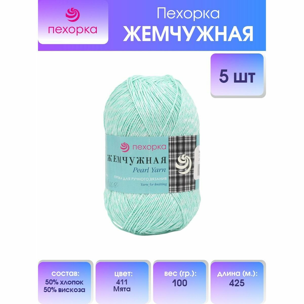 Пряжа для вязания крючком, спицами Пехорка Pehorka Жемчужная, тонкая, хлопок/вискоза, цвет 411, мята, 5 шт. по 100 г, 425 м