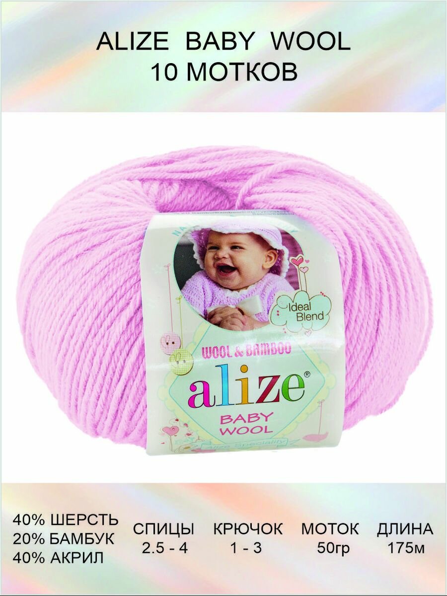 Пряжа для вязания ALIZE BABY WOOL Ализе Бэйби Вул Детская: 185 (светло-розовый) / 1 шт / 175 м / 50 г / 40% шерсть, 20% бамбук, 40% акрил