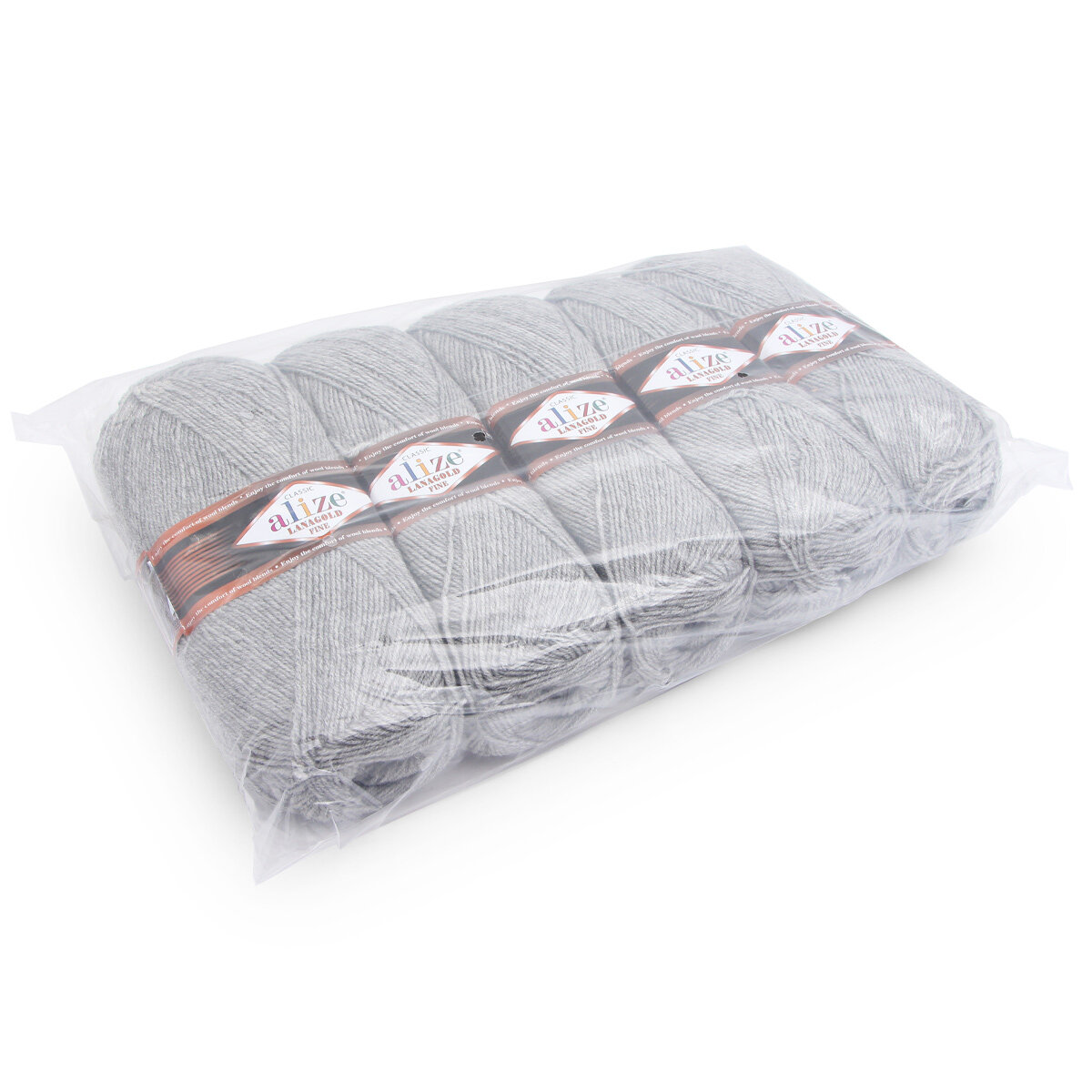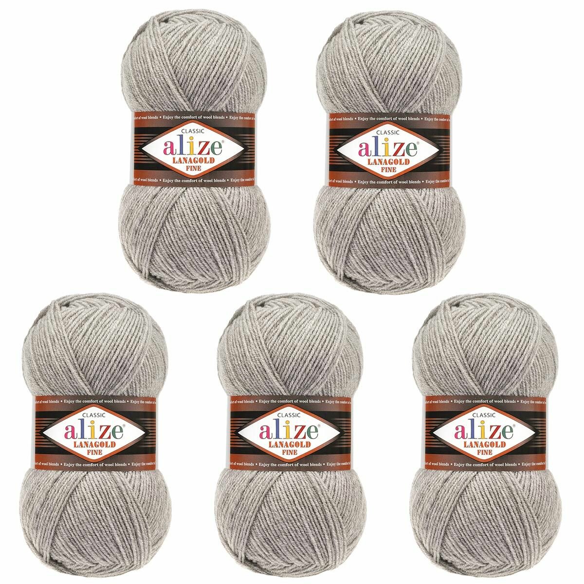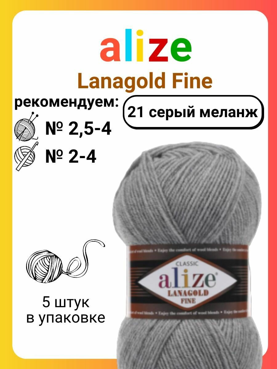 Пряжа ALIZE LANAGOLD FINE, серый - 21, 49% шерсть, 51% акрил, 5 мотков, 100 г, 390 м.