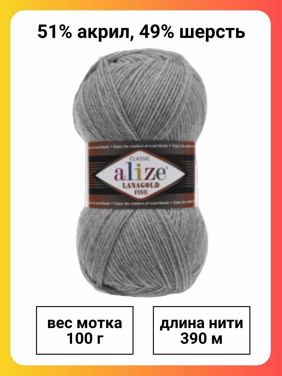 Пряжа Alize Lanagold Fine (Ланаголд Файн) - 1 шт Цвет: 348 серый 49% шерсть, 51% акрил 100г 390м
