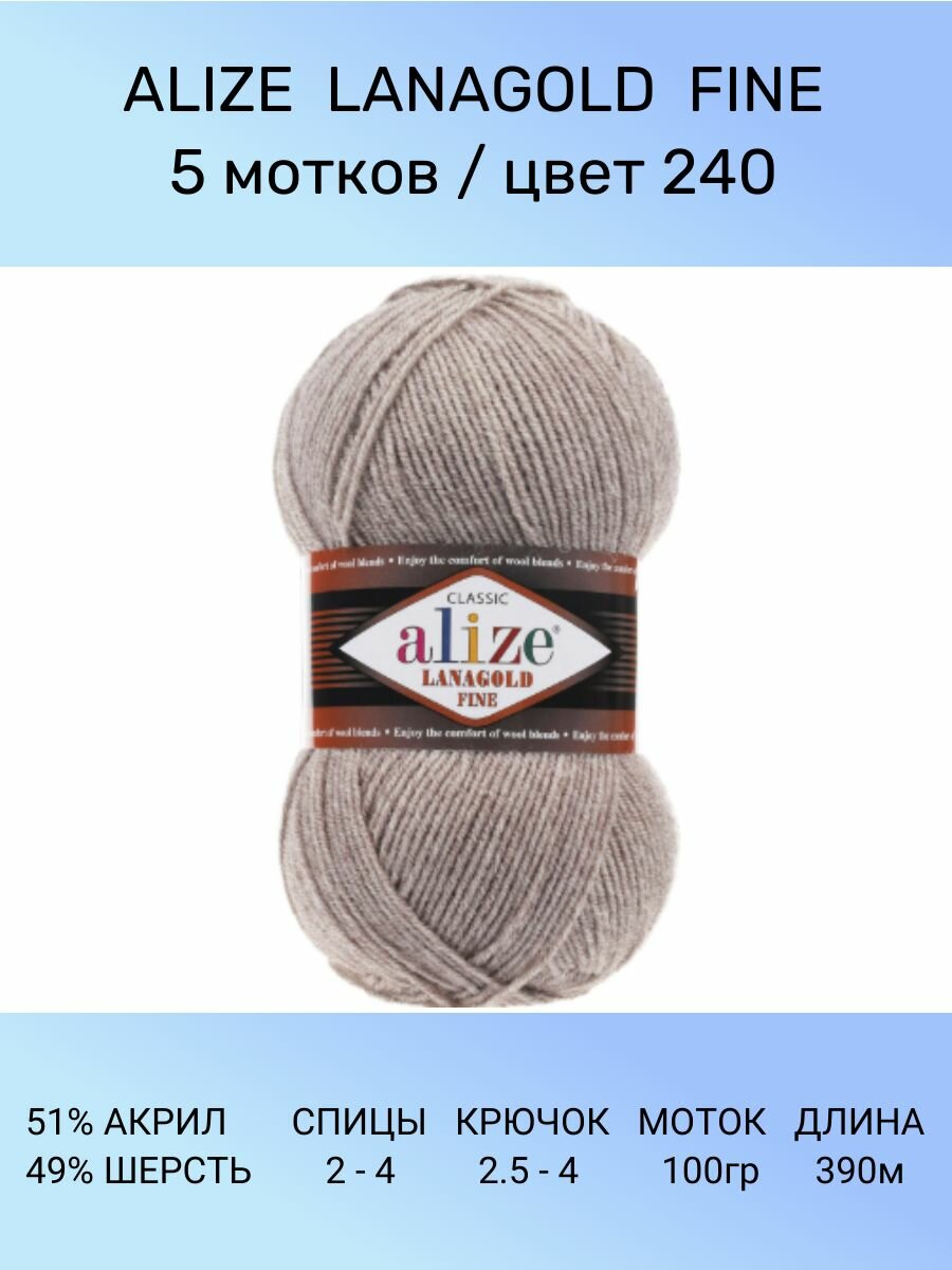 Пряжа для вязания ALIZE LANAGOLD FINE: 5 (бежевый), 5 шт 390 м 100 г, 49% шерсть 51% акрил