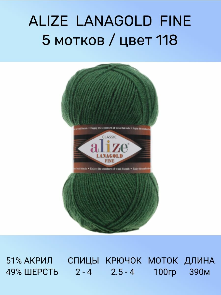 Купить Пряжа Alize Lanagold Fine зеленая трава (118), 51%акрил/49%шерсть, 390м, 100г, 5шт