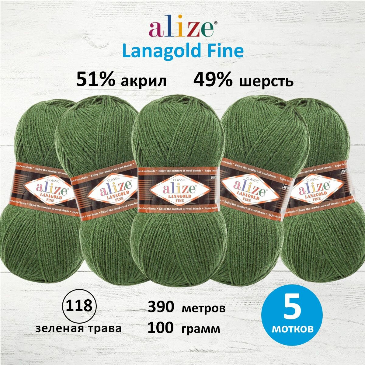 Пряжа Alize Lanagold Fine (Ализе Ланаголд Файн) - 5 мотков, 118 зеленая трава, 49% шерсть, 51% акрил 390м/100г