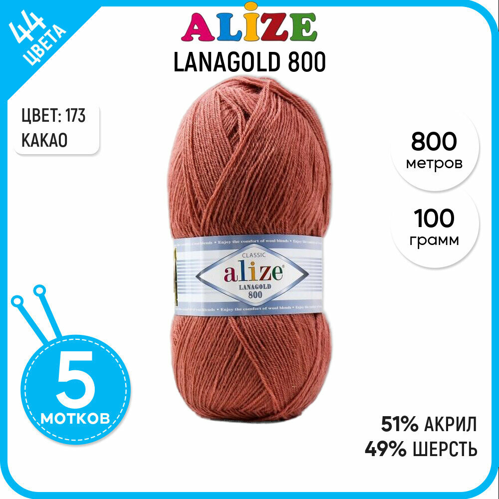Пряжа для вязания крючком, спицами, Alize, Ализе, LanaGold 800, средняя, акрил, шерсть, цвет 173, какао, 5 шт. по 100 г, 800 м
