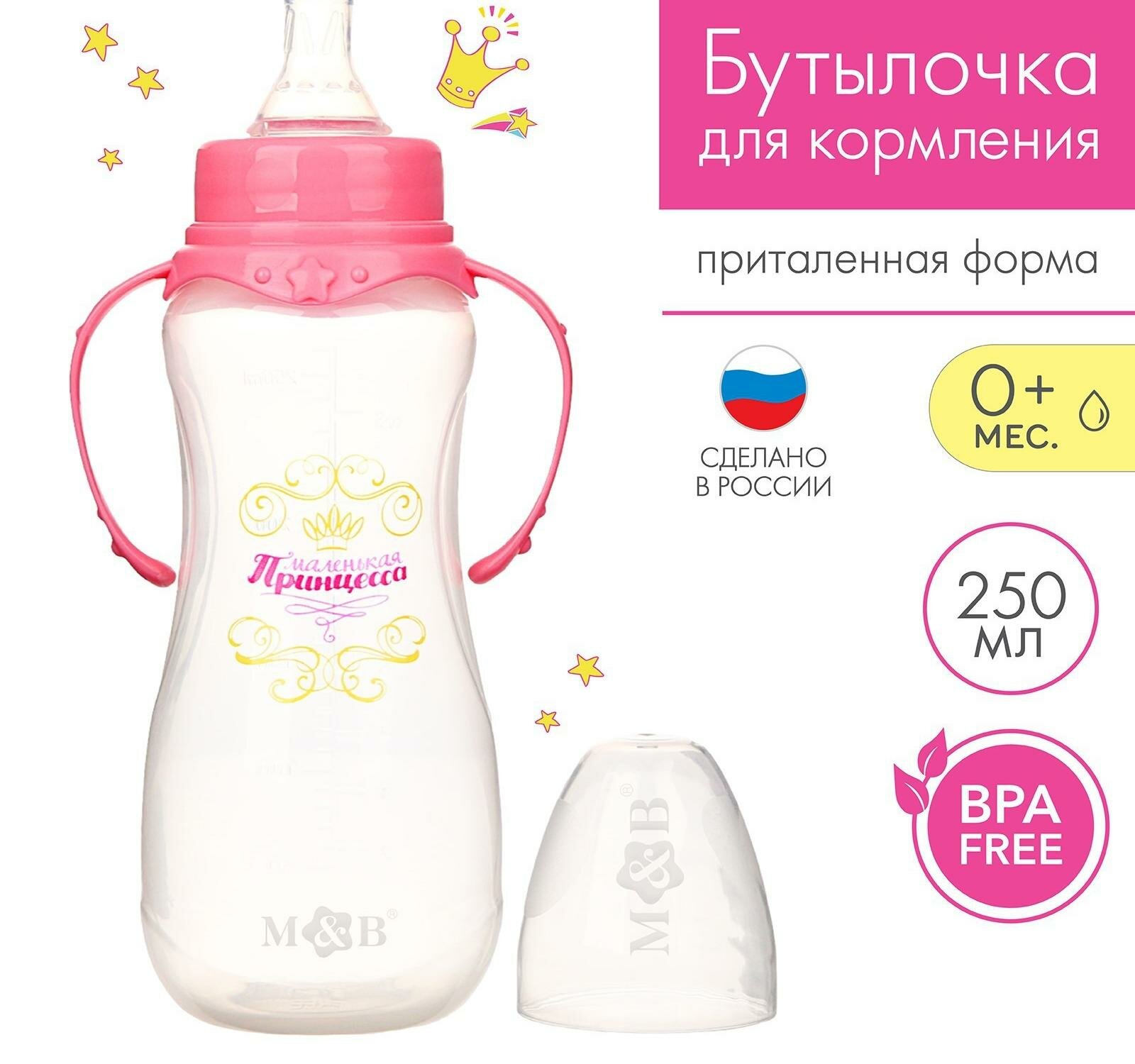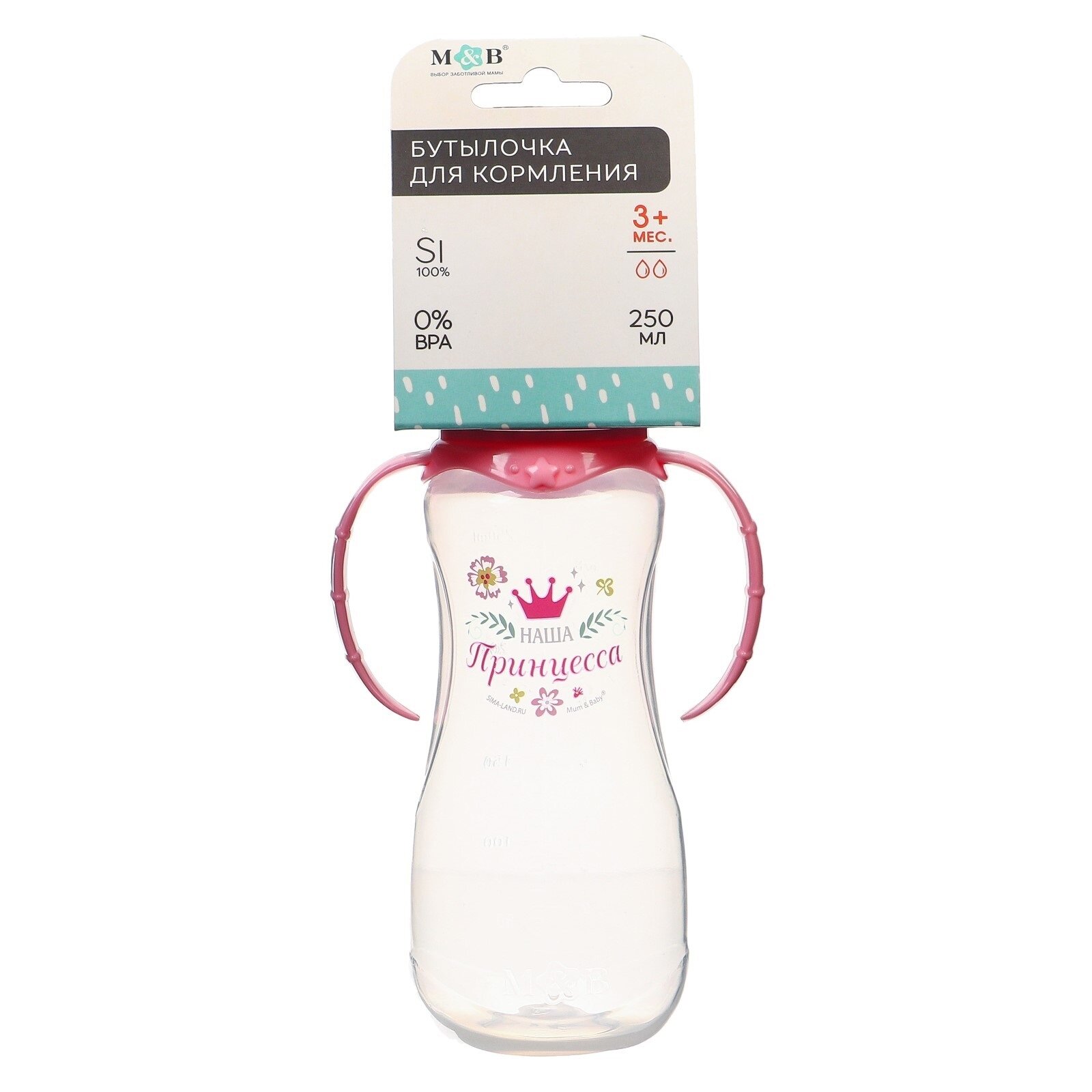 Mum&Baby Бутылочка для кормления «Принцесса» детская приталенная, с ручками, 250 мл, от 0 мес., цвет розовый