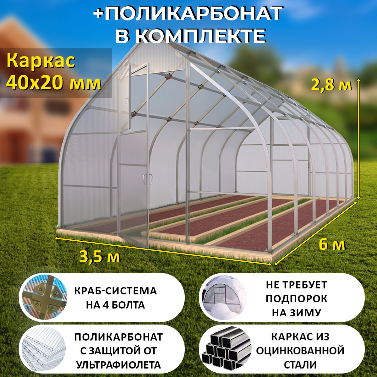 Купить Теплица Каплевидная (Поликарбонат в комплекте) 3.5 х 6 метров, оцинкованный каркас 40х20 мм - Стрелецкая Люкс