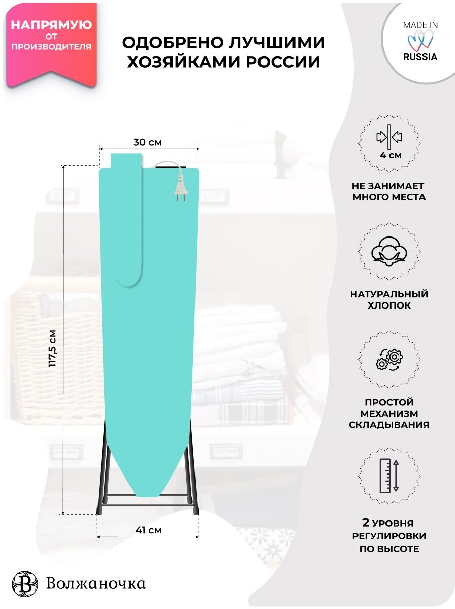 СохранитьВолжаночка Доска гладильная напольная складная с подрукавником, подставкой для утюга, розеткой и удлинителем, размер 110х30 см., цвет бирюзовый интересное: