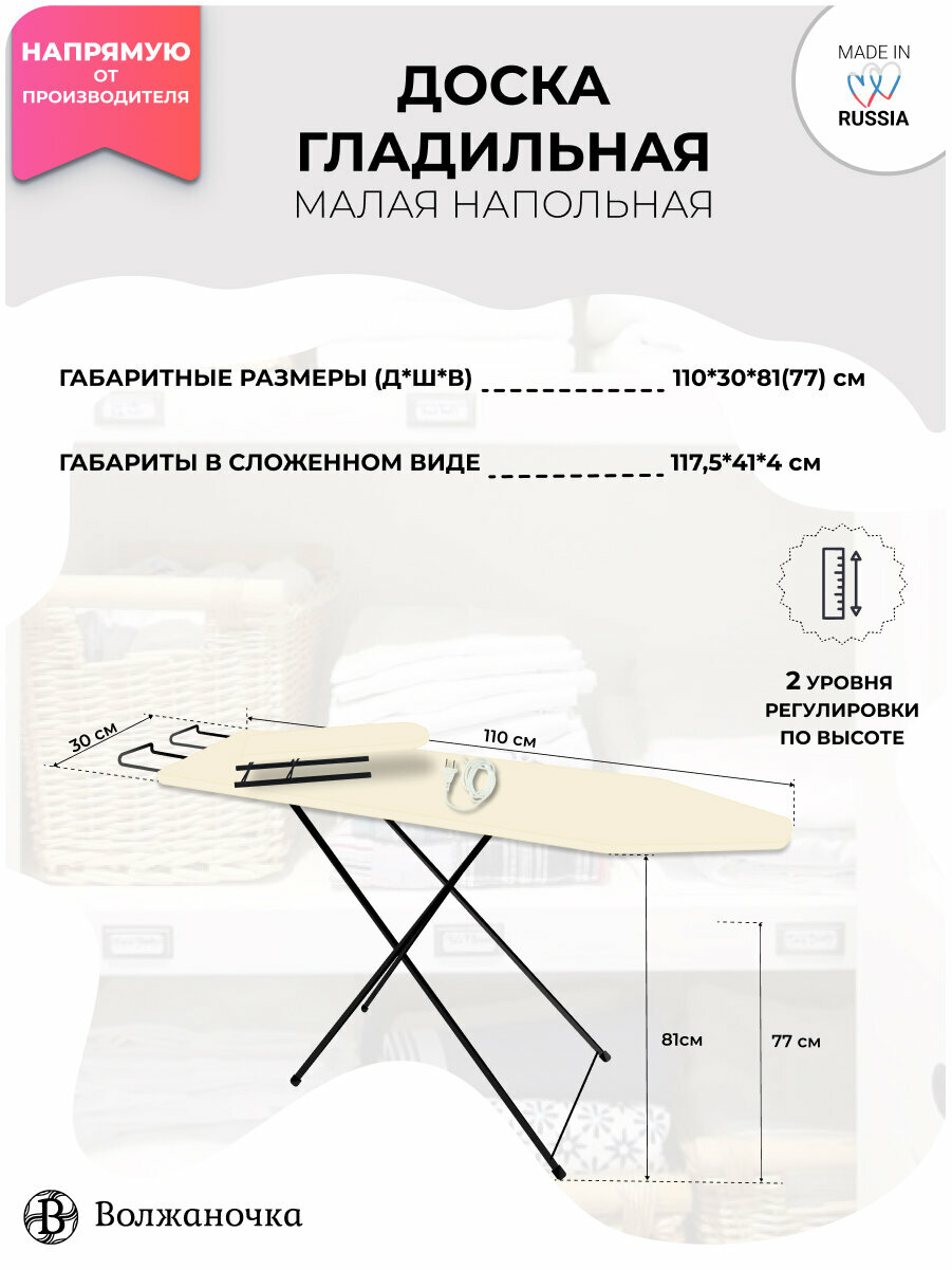 СохранитьВолжаночка Доска гладильная напольная складная с подрукавником, подставкой для утюга, розеткой и удлинителем, размер 110х30 см., цвет сливочный интересное: