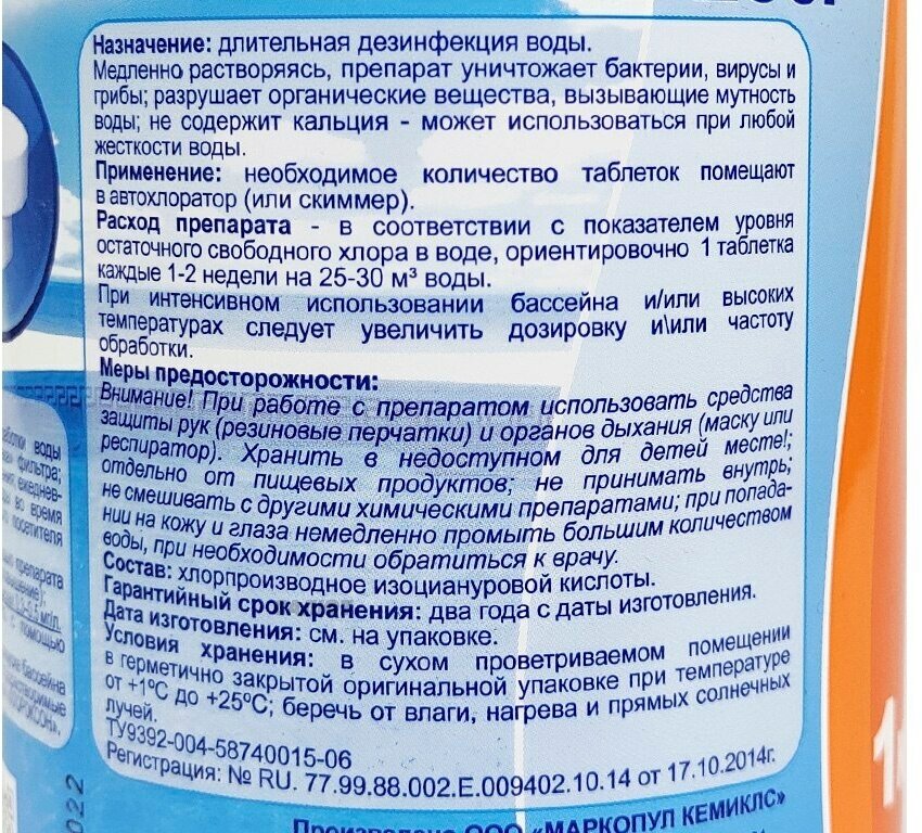 | Минусы: | Таблетки долгорастворяющиеся, в описании этого нет. На качестве воды никак не отразилось. Вода как была умная так и осталась. Запаха хлора от воды нет. Вода мутные,появляется налёт, хотя в описании сказано что именно от этого. Взял только из за хороших отзывов. Может и дензифицировало воду, но на качество, прозрачность и образование слизи не влияет. Посоветовали залить перекись. Вода стала кристально как в спортивных бассейнах. |