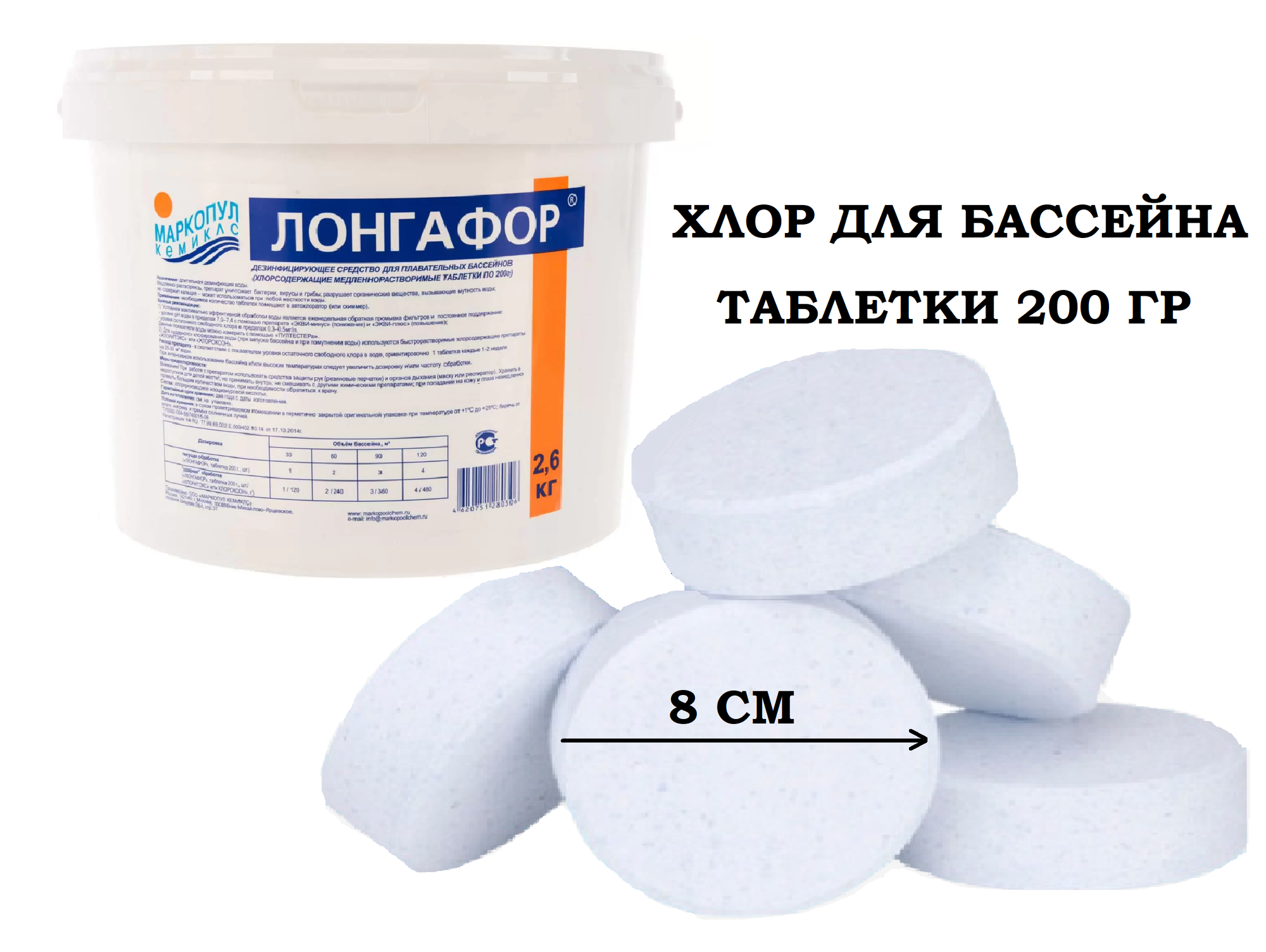 Химия для бассейна "Лонгафор" (1 кг) Хлорные таблетки 200 гр. / Средство для ухода за водой "Маркопул Кемиклс", Медленный хлор для дезинфекции и очистки воды