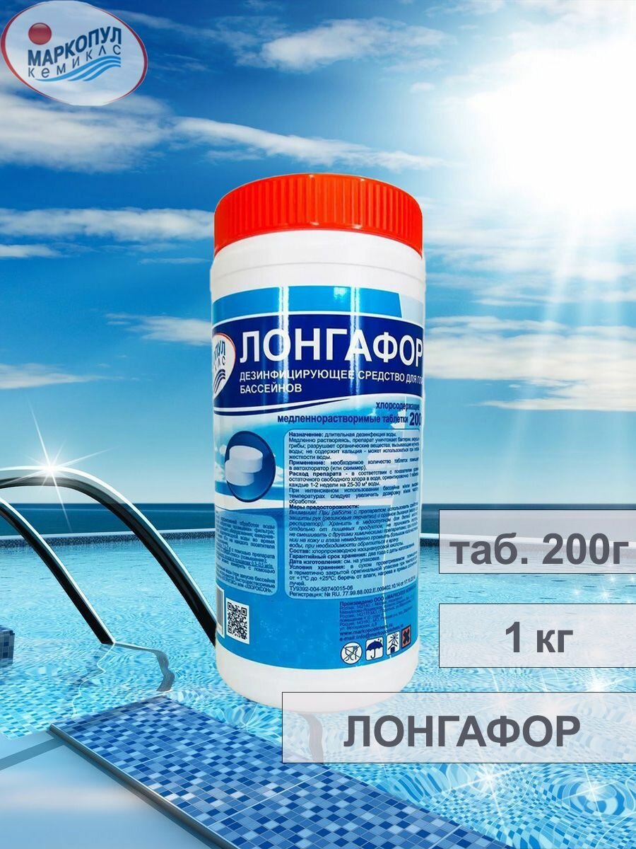 Химия для бассейна "Лонгафор" (1 кг) Хлорные таблетки 200 гр. / Средство для ухода за водой "Маркопул Кемиклс", Медленный хлор для дезинфекции и очистки воды