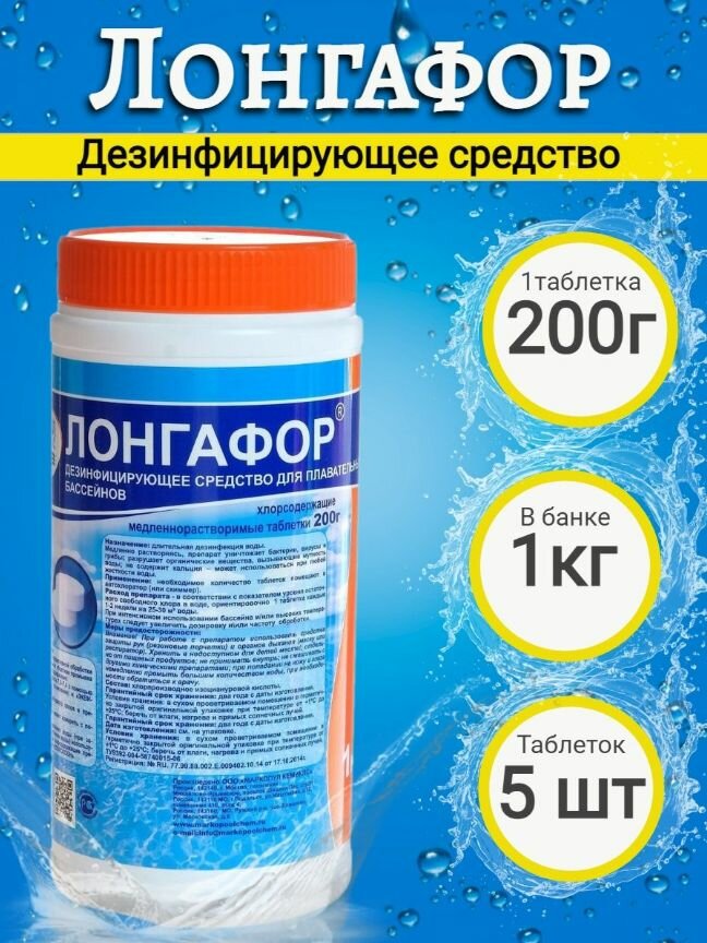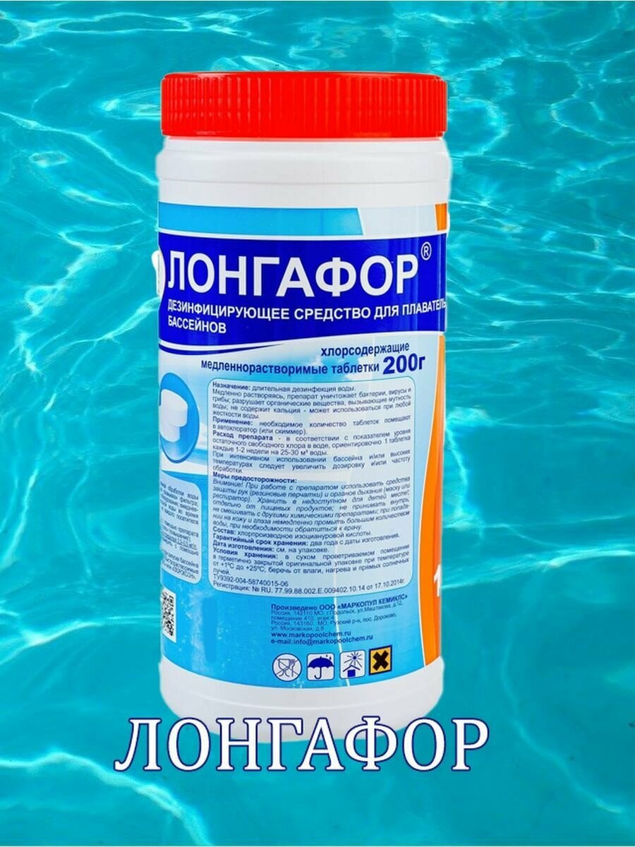 Дезинфицирующее средство"Лонгафор" таблетки 200 г, для воды в бассейне, банка, 1 кг Маркопул Кемик .